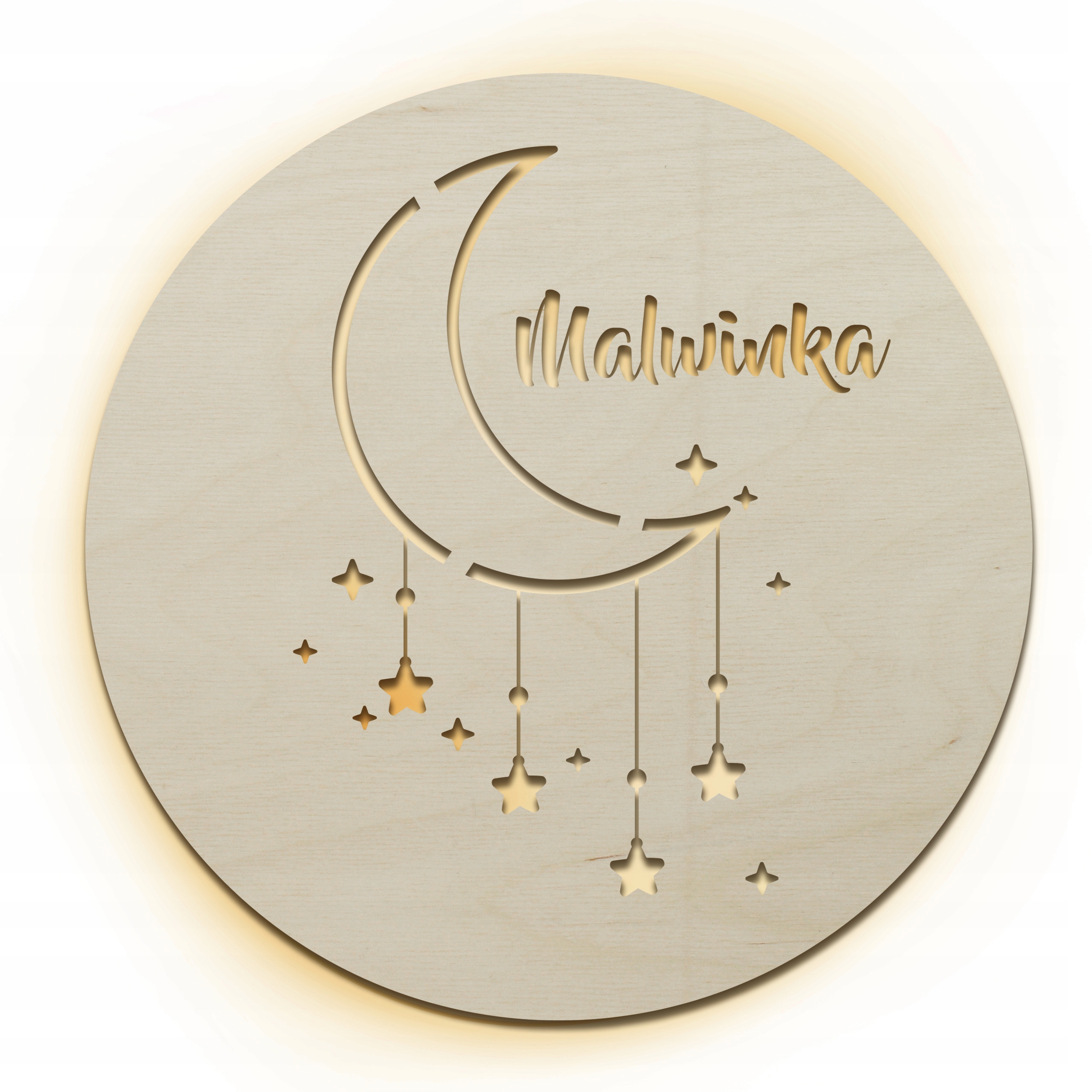 Дерев'яна світлодіодна лампа з іменем дитини на стіні.