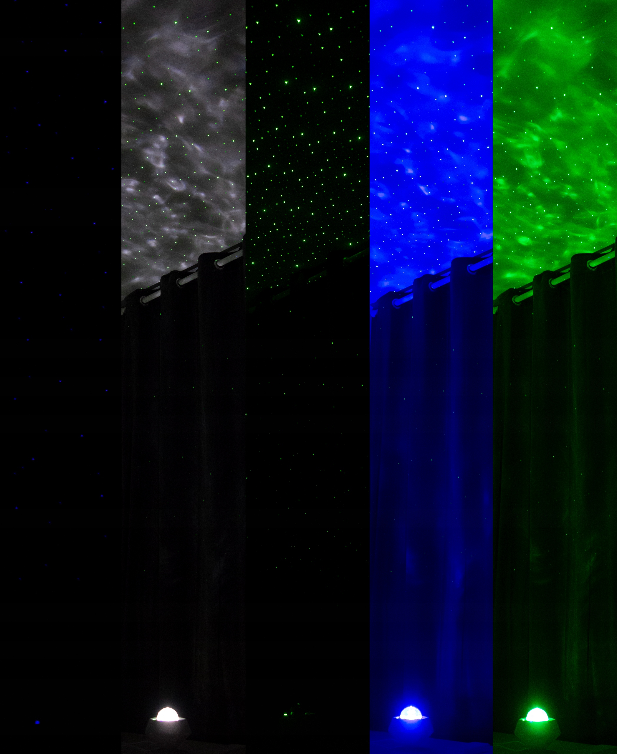 Пристрій може випромінювати проекцію барвистої та заспокійливої галактики, неба, океанських хвиль або працювати по черзі чи разом .