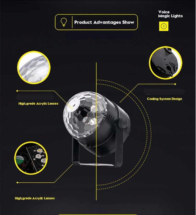 Три -кольорське дискотечне світло невелике і легко перенесе. Трикольоване дискотечне світло може висвітлити кімнату на 100 квадратних футів. Чим темніше оточення, тим краще освітлюючий ефект. Підходить для різних внутрішніх подій і є найкращим освітленням для вечірки.