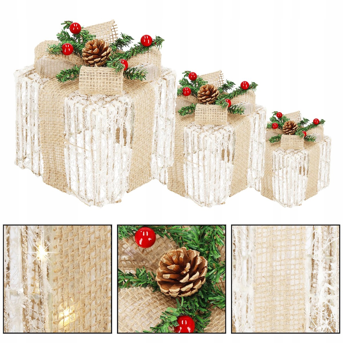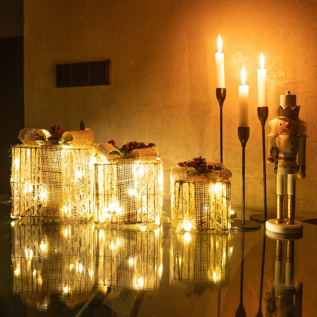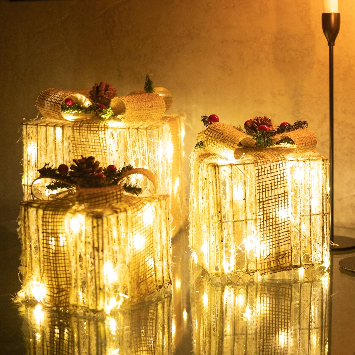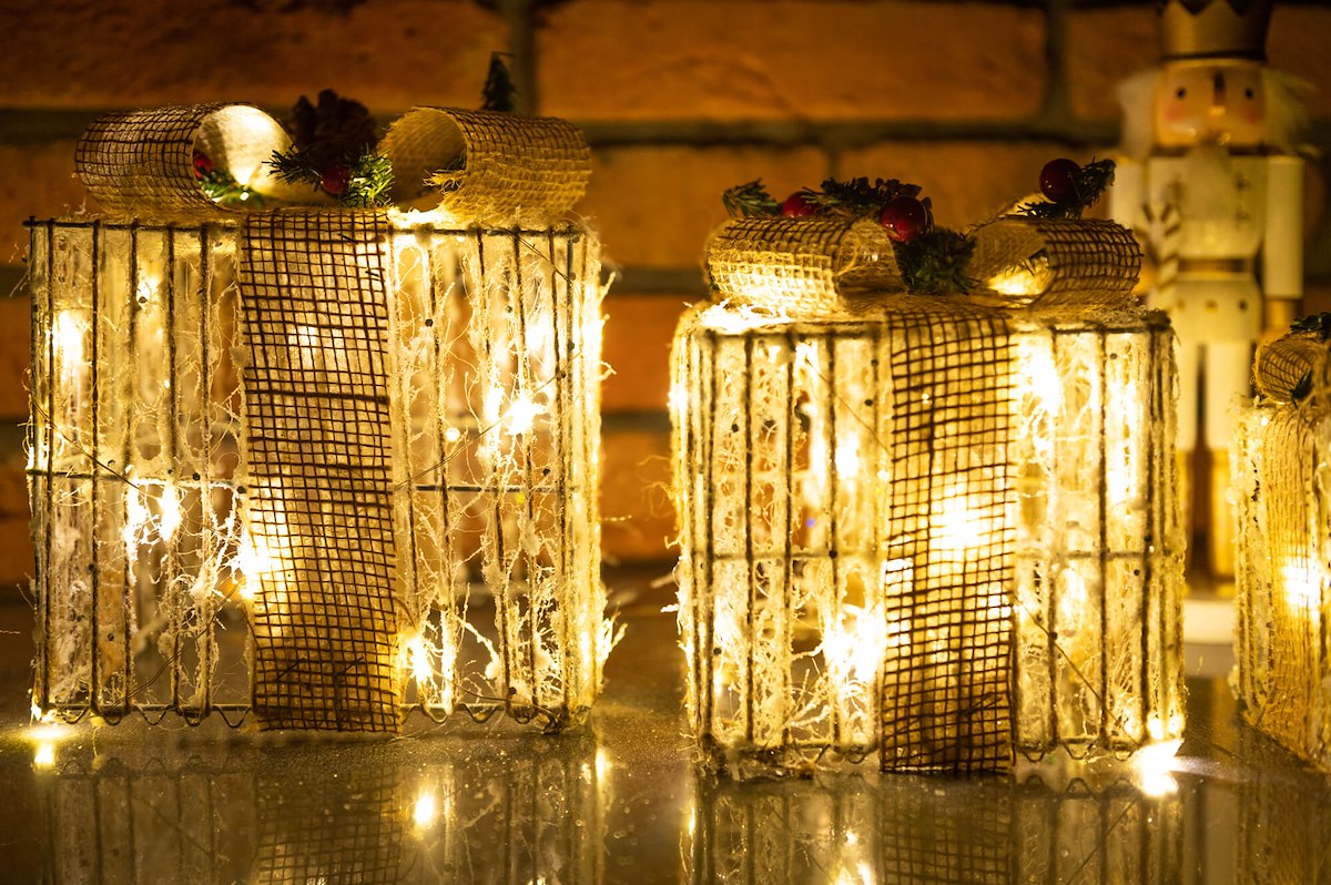 Не можна заперечувати, що грудневі свята асоціюються з красивими тематичними декораціями та дивовижним блиском лампи. Що, якби ви могли поєднати ці дві прикраси разом? Виберітьнабір подарунків, обмотаних дротом зі світлодіодами, і створіть приголомшливу прикрасу у своєму домі, яка чудово виглядає як удень, так і в темряві!