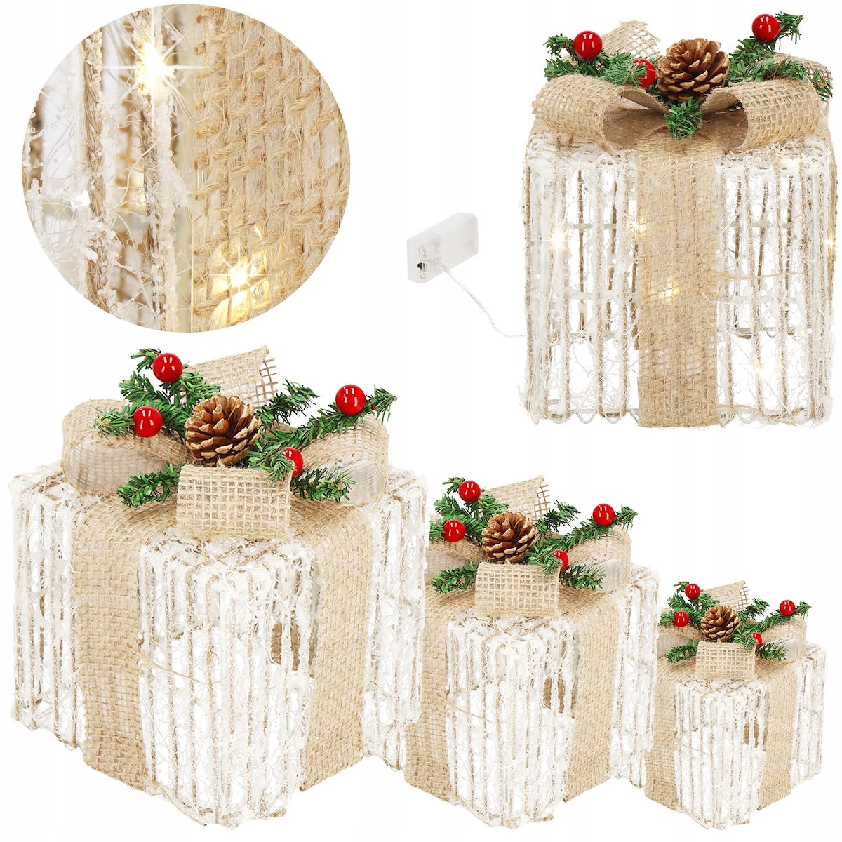 Варто підкреслити перевагу світлодіодних проводів, які використовувалися для освітлення цих подарунків. Невидимі, делікатні, які чудово поєднуються при освітленні - ось що вони. Вони живляться від батарейокe (не входять до комплекту), тож вам не доведеться шукати розетку.
