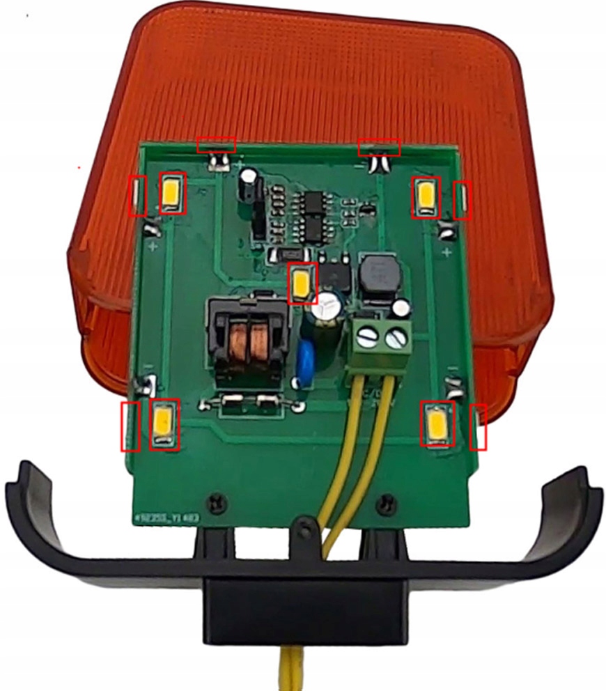 Лампа дуже яскрава і без технічного обслуговування в класичній лампочці вібрації, світлодіоди використовуються тут у кількості до 16 штук! Світлодіоди розміщуються з усіх боків: 5 ПК спереду та 5 ПК ззаду, 2 елементи з кожного боку та 2 шт. Це рішення означає, що світло можна побачити однаково з усіх боків. Лампа виготовлена в технології IP 54, тому її зовнішні умови не жахливі. Крім того, лампа оснащена внутрішньою перериванням 1 Гц, яку можна легко вимкнути за допомогою перемички, розміщеного на друкованій пластині.
