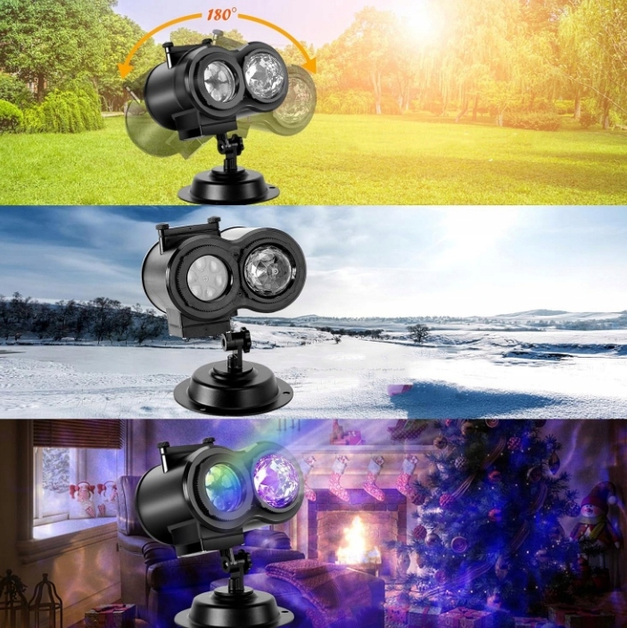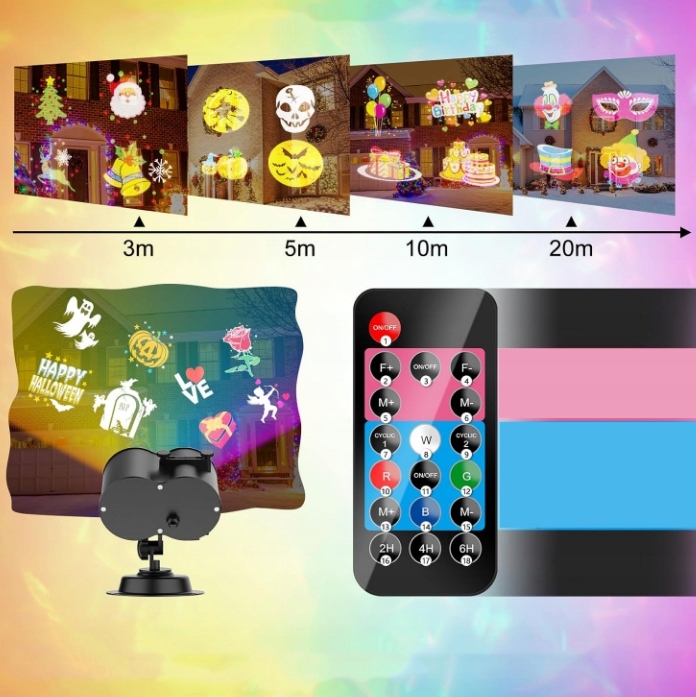 2 проекцій , включаючи червоний, білий, синій, зелений, червоно-зелений, червоно-блакитний, червоно-білий, зелений та білий, зелений синій та синьо-білий. Ви також можете вибрати 2 проекційні ефекти, щоб створити святкову атмосферу, оскільки інша головка проекції може змінити до 12 символів , включаючи Різдво, Хеллоуїн та інші.