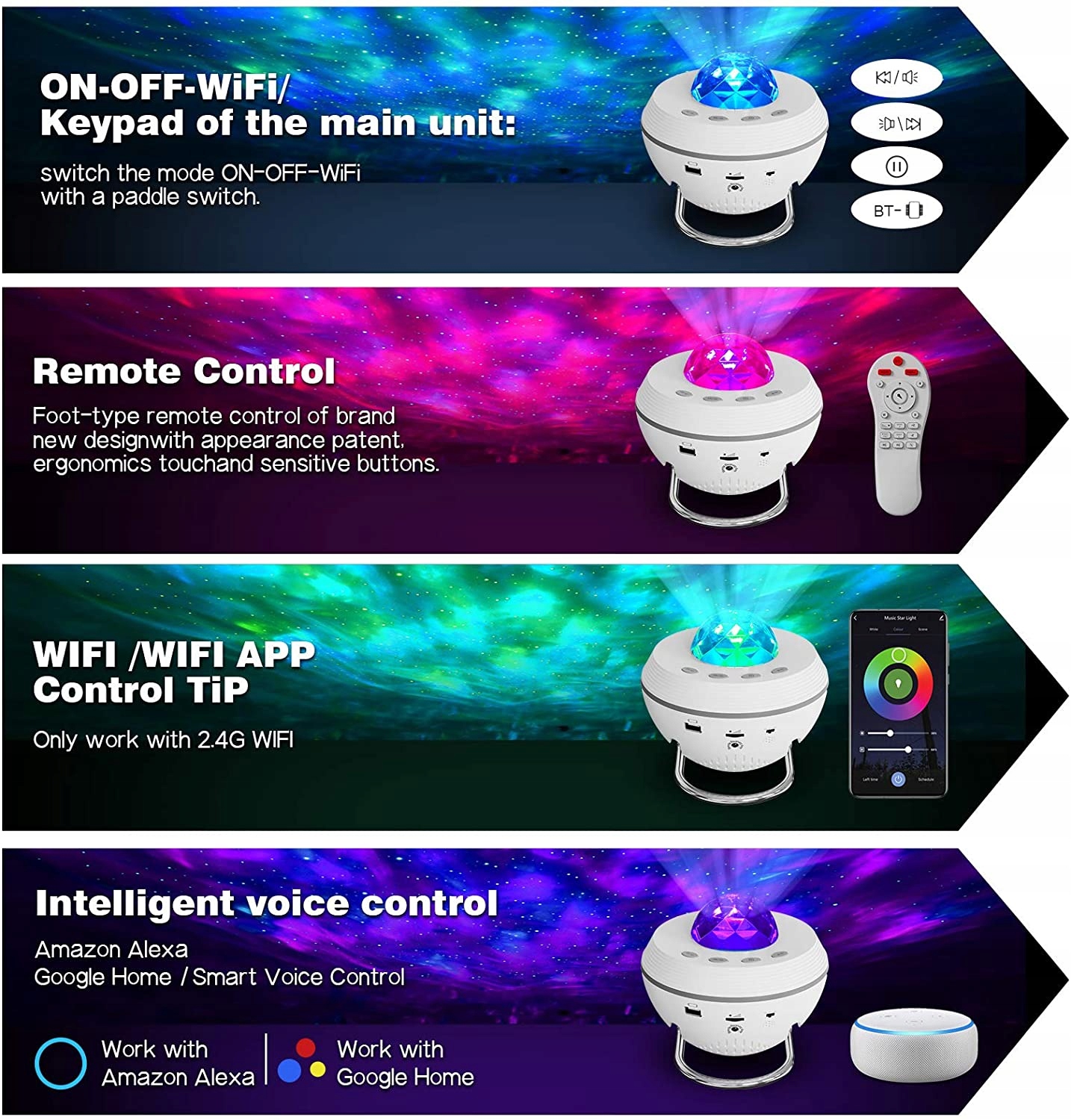 - Проектор Galaxy, працює з Alexa, Google Assistant: ALEXA керує розумним світлодіодним музичним освітленням. Навіть ваша дитина може легко сказати щось на кшталт «Alexa, увімкни світло музичної зірки». Просто використовуйте інтуїтивно зрозумілі голосові команди, щоб увімкнути/вимкнути світло, зменшити/збільшити яскравість або налаштувати кольори світла. Примітка: (Підтримується лише 2,4 ГГц Wi-Fi.)
