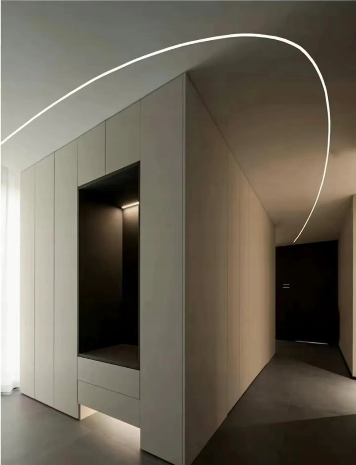 Гнучкий профіль GK FLEX розроблений для універсального застосування в підвісних стелях і стінах з гіпсокартону, що робить його відмінним вибором як для сучасних житлових інтер'єрів, так і для офісних приміщень. Його гнучкість дозволяє легко адаптуватися до різних поверхонь, дозволяючи створювати унікальні візерунки та форми - від простих ліній світла до більш складних дуг або декоративних півкіл. Така конструкція відкриває широкі можливості для облаштування, надаючи інтер'єру неповторний і елегантний характер. Виготовлений з високоякісного алюмінію, гнучкий профіль характеризується надзвичайною міцністю і стійкістю до механічних пошкоджень, що забезпечує його довговічність і надійність. Крім того, силіконовий непрозорий абажур дозволяє рівномірно розсіювати світло, усуваючи точковий ефект і створюючи затишну, гармонійну атмосферу.