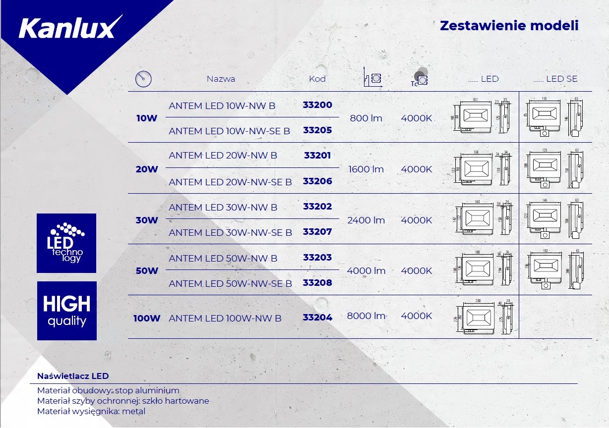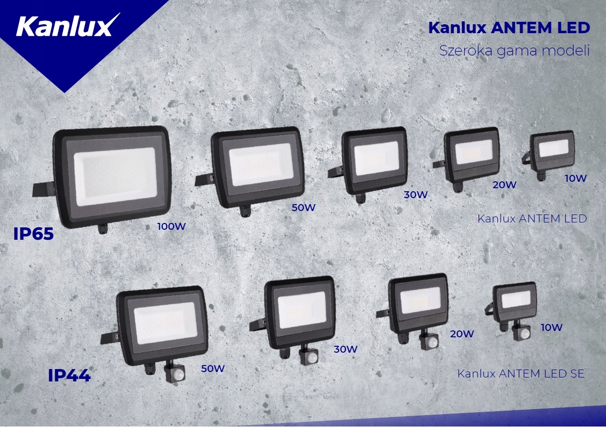Kanlux ANTEM SE — серія світлодіодних прожекторів з датчиком руху. Ці прожектори, перш за все, легко підключаються, а завдяки вбудованій розподільній коробці ми також уникаємо непривабливих кабельних з’єднань. Kanlux ANTEM LED SE пропонує широкий діапазон потужності від 10 Вт до 50 Вт. Абажур з тонкою призмою м'яко розсіює світло і обмежує ефект відблисків. Прожектори характеризуються високим рівнем герметичності IP44. Для датчика руху можна налаштувати час освітлення, інтенсивність світла та зону виявлення.