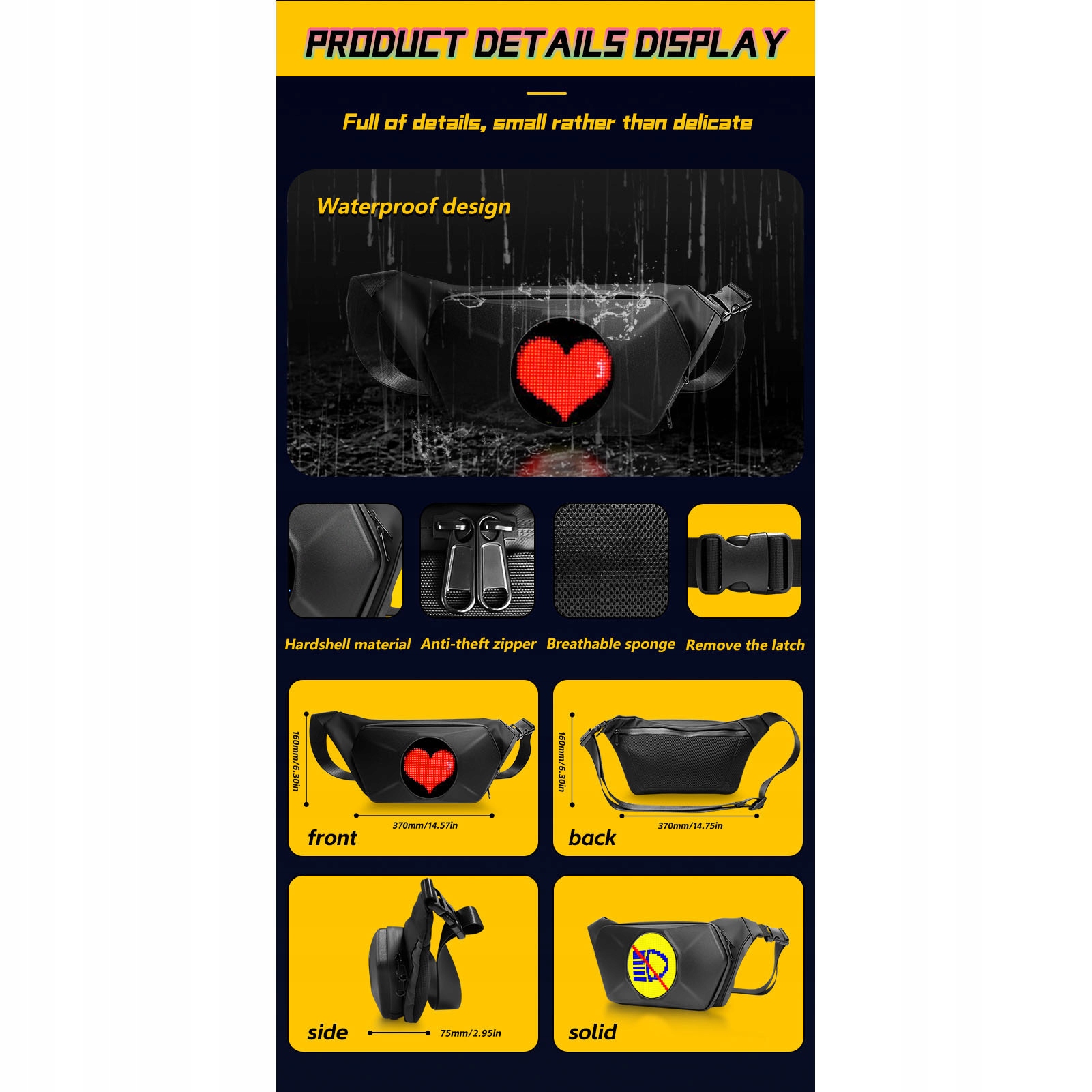 2. Великий простір для зберігання: Незважаючи на компактний розмір близько 14,57 х 6,30 x 2,95 дюйма, сумка світлодіодних дисплеїв містить дві великі кишені блискавки та кілька камер. Він призначений для зручного зберігання необхідних речей, таких як складна парасолька, планшет, телефон, рукавички, сонцезахисні окуляри, косметика, тканини, клавіші та гаманець, гарантуючи, що все організовано та легко доступно.