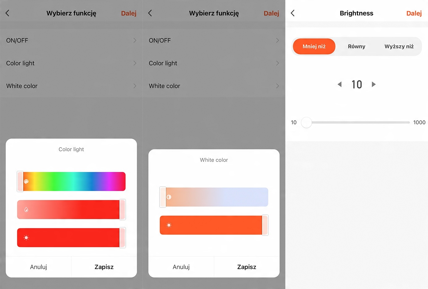 - Програма TUYA пропонує можливість змінювати кольори за допомогою вбудованого кольорового кільця, крім того, ми можемо затемнювати або освітлювати вибраний колір або змінити його температуру білого кольору.