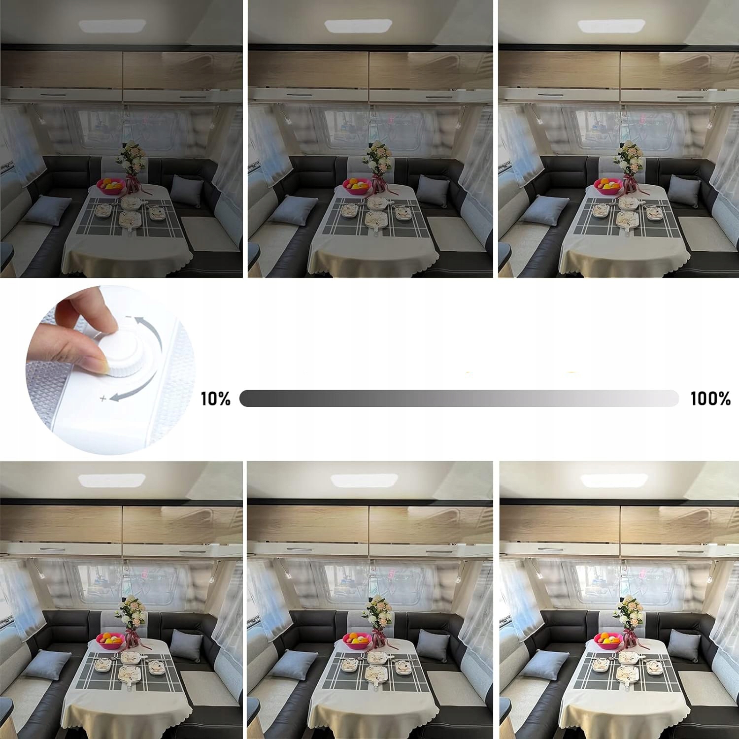 🟡【Діммований】: можна регулювати яскравість трьох кольорів. Натисніть кнопку, щоб змінити колірну температуру. Ручка регулює яскравість. Цей тип внутрішнього освітлення для автофургону відповідає різним вимогам до освітлення для різних сцен.