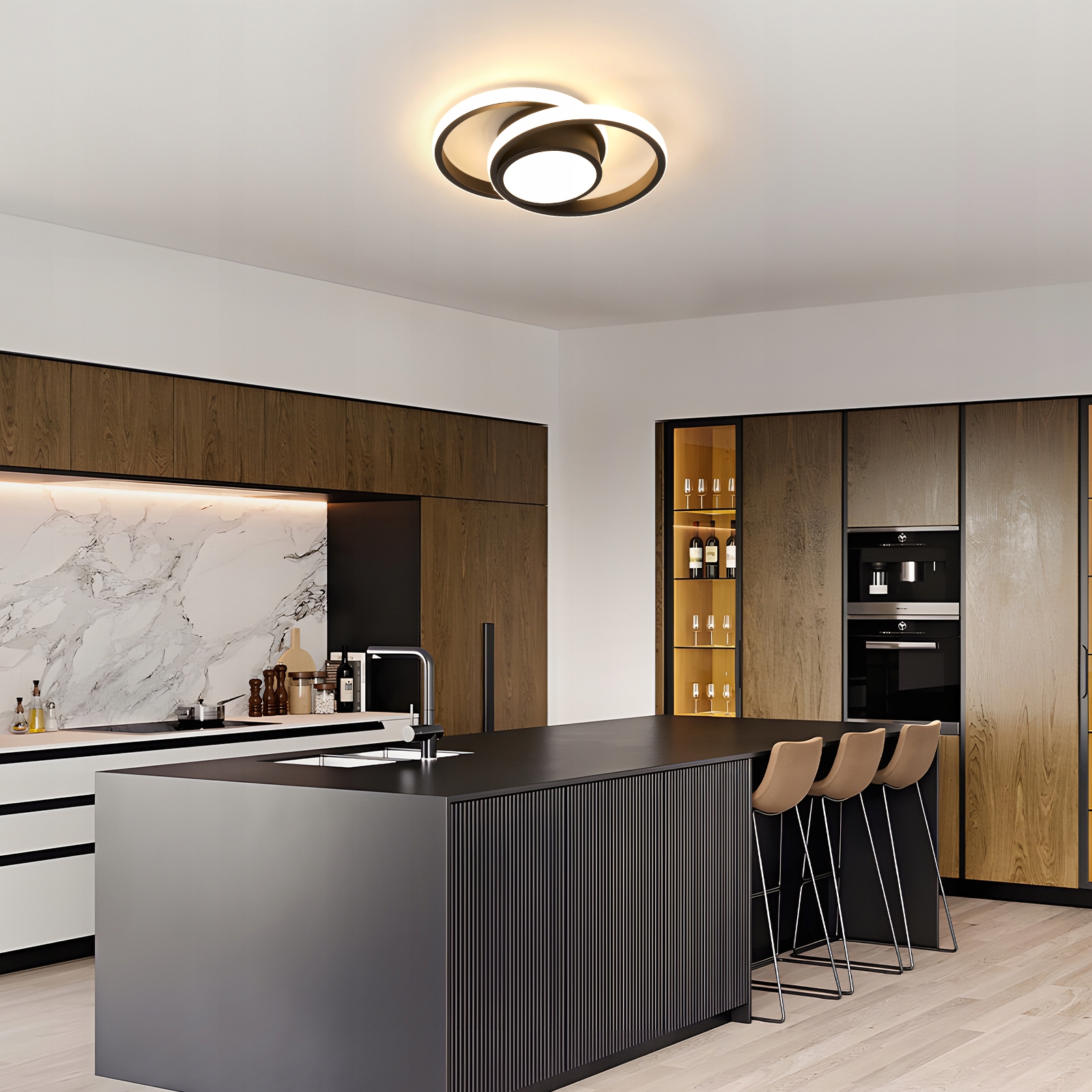 Цей світлодіодний стельовий світильник — це інноваційний світлодіодний стельовий світильник із подвійним кільцем. Два пересічні кільця великого діаметру створюють стильний і сучасний вигляд, додаючи неповторної естетики вашому інтер’єру. Цей вишуканий, але не монотонний дизайн додає вашому дому сучасний відтінок. Він забезпечує достатнє та комфортне освітлення.