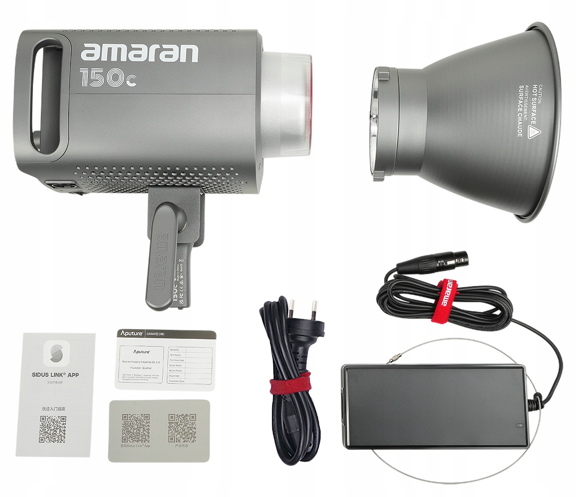 В набір входить світлодіодна лампа Amaran 150c - сіра, захисна кришка, чаша Hyper Reflector з кріпленням Bowens, транспортний кейс, кабель живлення та блок живлення.