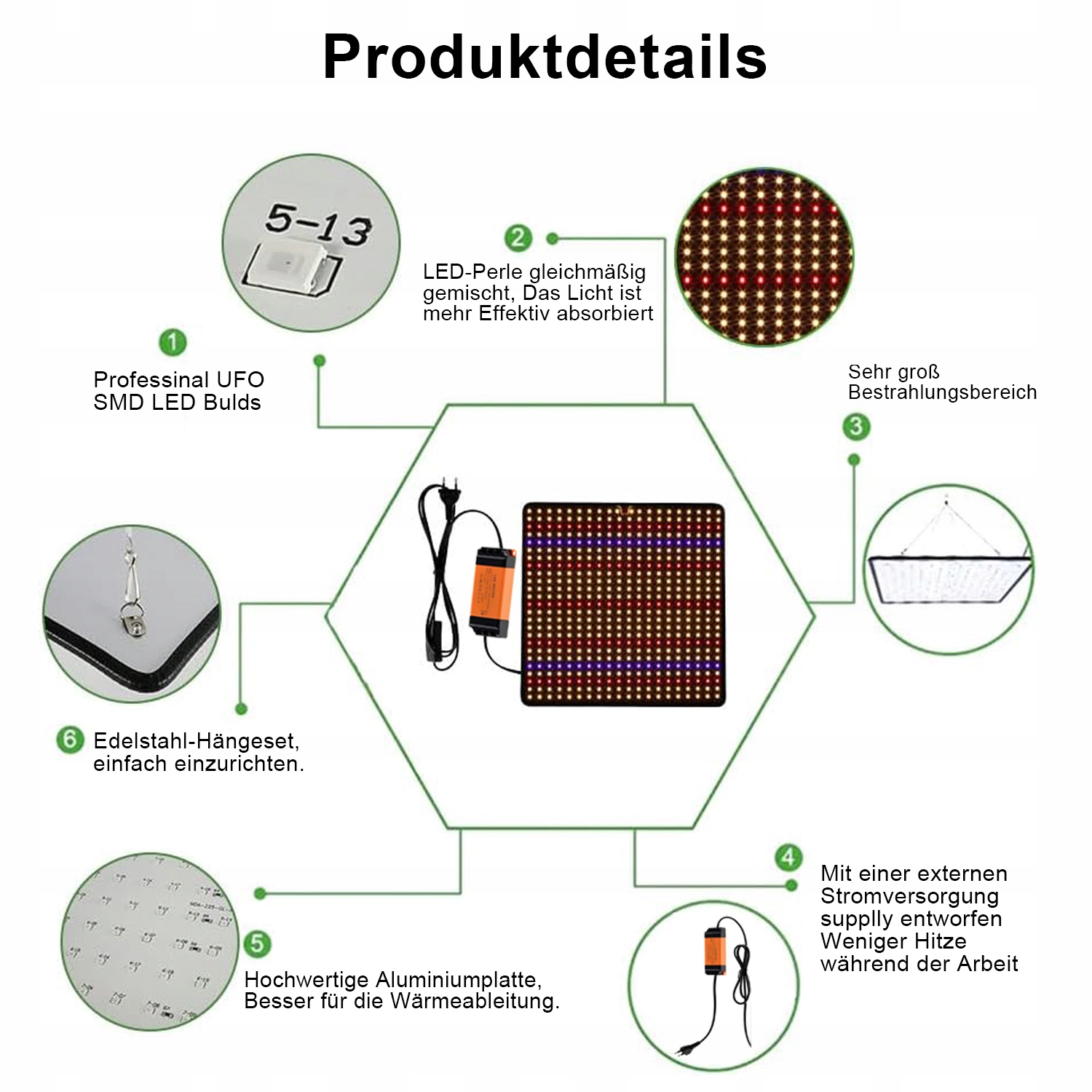 Світлодіодний світильник потужністю 45 Вт із 500 намистинами розроблено для сприяння здоровому росту рослин без надмірного використання енергії. Його низька тепловіддача гарантує, що він не підвищить температуру в приміщенні, що робить його безпечним і надійним для використання всередині приміщень. Ця міцна світлодіодна панель, створена для довговічності, постачається з комплектом підвіски, що робить її ідеальною для вирощування різноманітних рослин.