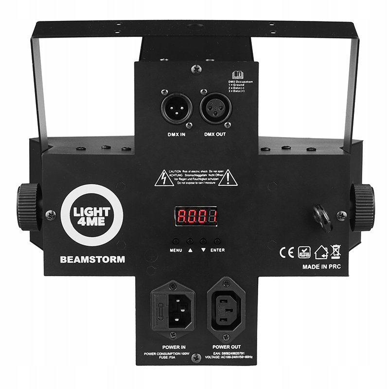 Завдяки диммеру повного діапазону, стробу з регулюванням швидкості та вбудованим макросам, LIGHT4ME BEAMSTORM b> дозволяє точно налаштувати світлові ефекти відповідно до характеру події. Можливість змінити орієнтацію та вимкнути дисплей забезпечує ще більшу гнучкість розташування простору. Панель управління зі світлодіодним дисплеєм і 4 кнопками сприяє швидкому і безпроблемному встановленню параметрів навіть в умовах, що динамічно змінюються. Можливість керування за допомогою бездротового радіопульта робить пристрій надзвичайно зручним і простим у використанні, що цінують як професійні діджеї, так і люди, які організовують спеціальні заходи.