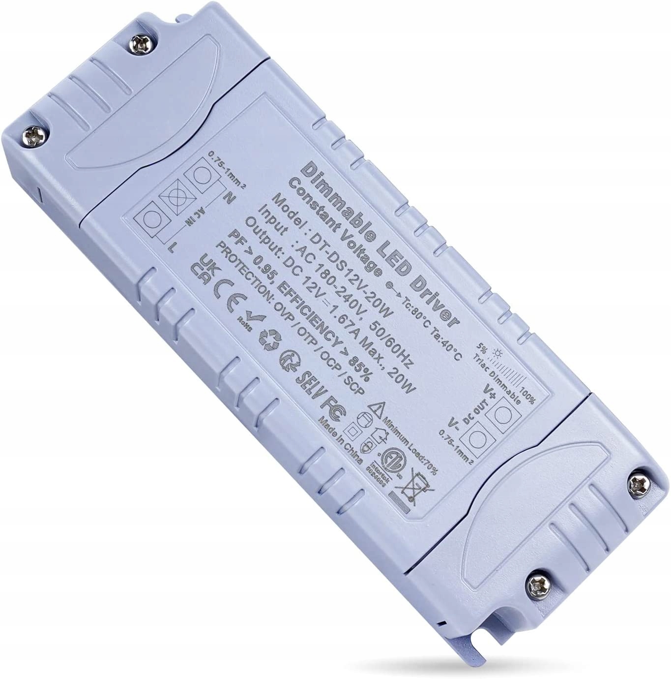 - Світлодіодний драйвер із постійним затемненням, затемнення TRIAC, вхід змінного струму 180-240 В, вихід 12 В постійного струму, 50/60 Гц, вогнестійкий матеріал, клас захисту II. (Несумісний зі світлодіодними лампами ПОСТІЙНОГО СТРУМУ.)