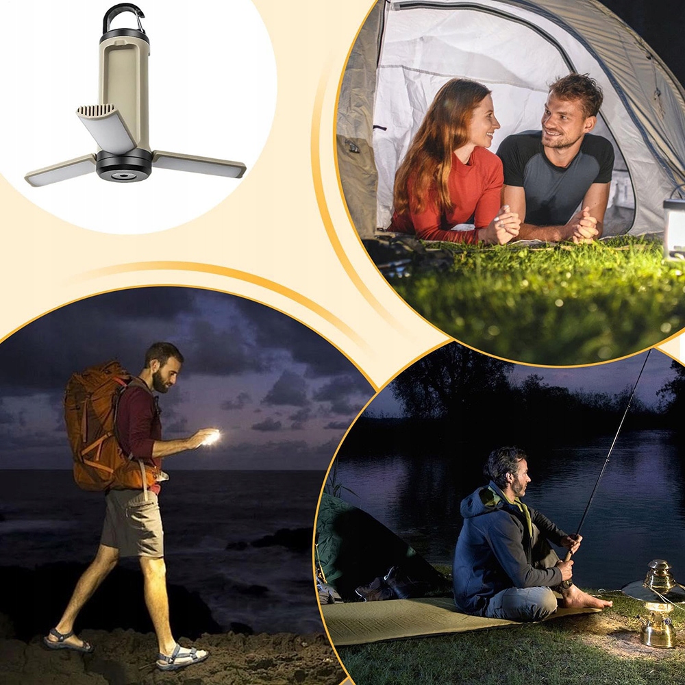 Особливості: аварійне зовнішнє освітлення, можна використовувати як акумуляторну батарею, 3 лопаті вентилятора можна розгортати на 90°, гачок, портативний, підвісний, кемпінговий, аварійний освітлення, підходить для різних сцен.