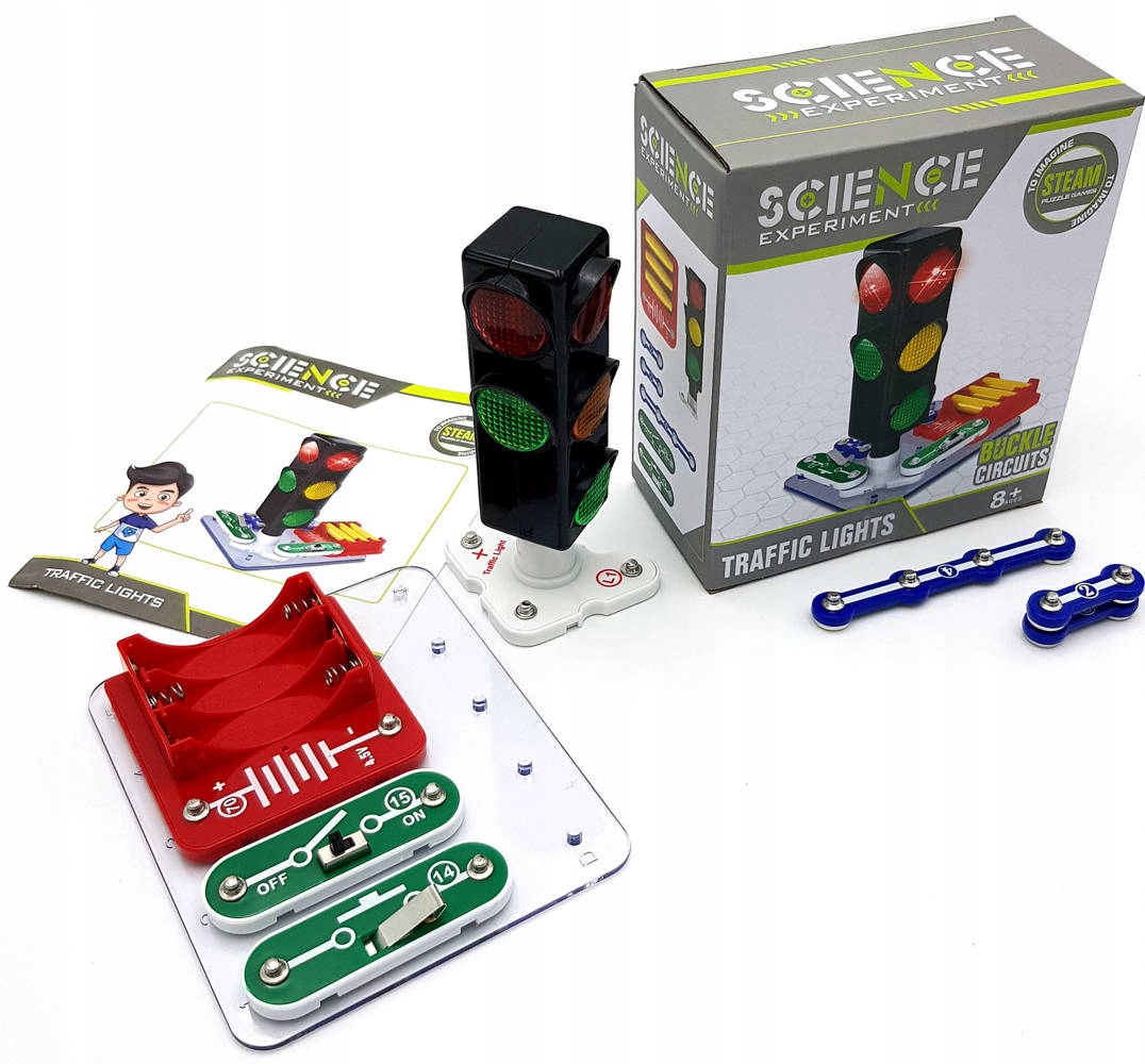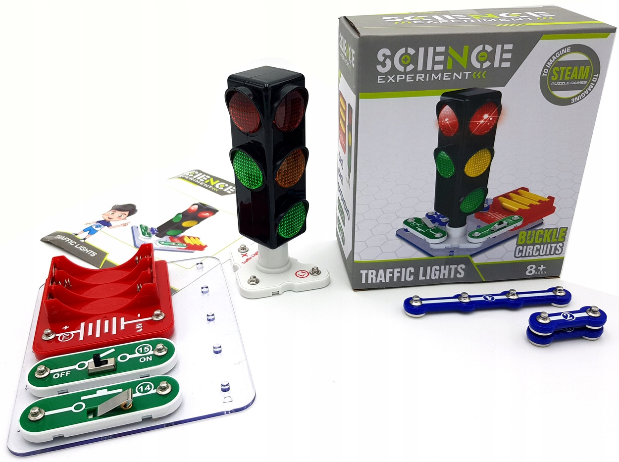 Набір зі світлофором дозволяє дітям слідувати інструкціям для підключення ланцюгів/пряжок для живлення світлофора. Живлення від 3 батарейок типу АА (не входять в комплект)