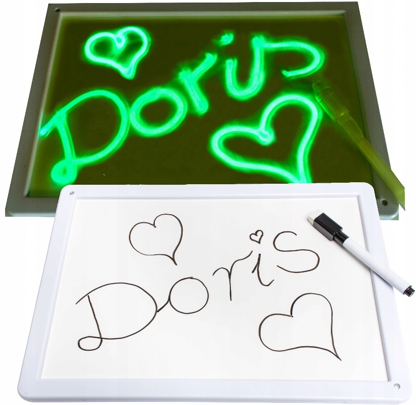 - Наш набір оснащений світловою дошкою для письма, UV LED ручкою та двома трафаретами для малювання. Перевагою світлової дошки є її оригінальність, легкість, зручність використання і найголовніше - вона не бруднить руки!