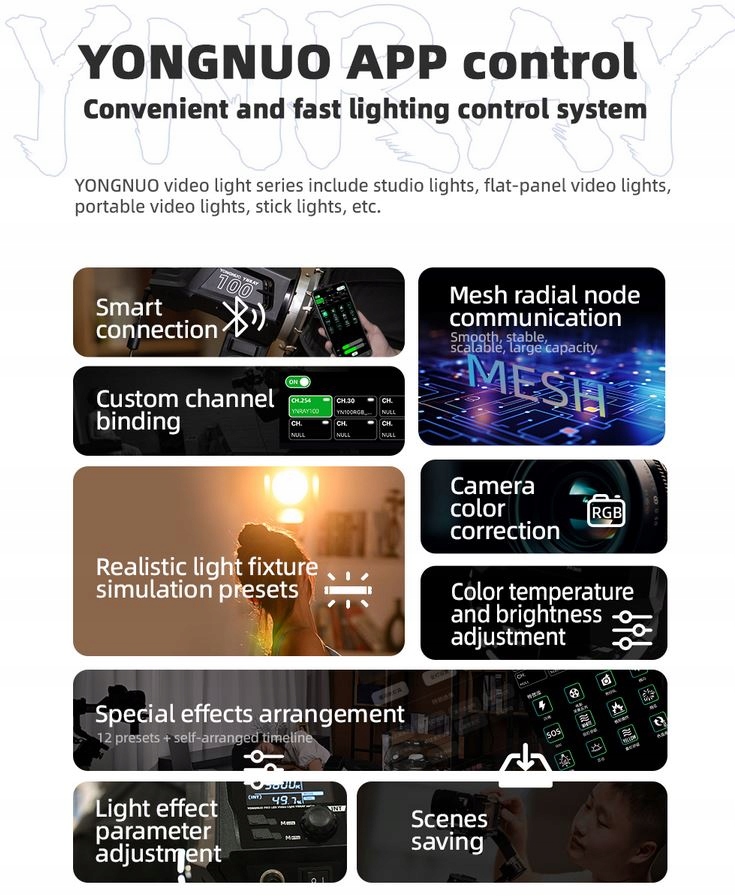 Зручна робота лампи Yongnuo Ynray100 забезпечує освітлений екран, ергономічну ручку та кнопки. Однак це ще не все. Завдяки мобільному додатку Yongnuo, пристрій можна контролювати віддалено, з відстані до 50 метрів. Це рішення також дозволить підключитися до інших світильників. Завдяки цьому ви створите обширний набір освітлення з доступом до 256 каналів бездротового зв'язку. Видовищні комбінації яскравості, спалахів або темних тем дозволять вам використовувати, серед інших З таких симуляцій, як плоть папарацці, гроза, вибух, схід сонця або пошкоджена лампочка. Завдяки їм, ви можете легко збагатити свої фільми з реалістичними спецефектами прямо з Голлівуду, не видавши властивість у команді піротехніки. Підключення пристрою до електричної розетки. Завдяки цьому ви будете використовувати повний 120 у живленнях, пропонованій пристроєм. Важливо, що лампа також сумісна з адаптерами живлення V-Mount. Завдяки цьому, нічого не заважає виводити пристрій на поле та досягти місця, де доступ до електроенергії обмежений. Набір