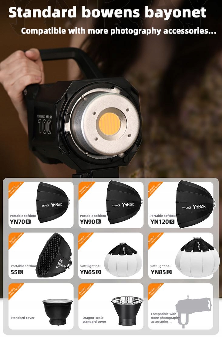 Лампа Yongnuo Ynray100 - це надійне джерело світла, яке понад 10 000 годин тестування при повній потужності, підтримуючи стабільність та повну чіткість. Це ідеальний вибір для фотографів, влогерів, режисерів, людей, що реалізують живі трансляції чи фотографії продуктів. Лампа завжди забезпечить оптимальне світло, яке буде працювати в десятках різних ситуацій. Цей невеликий та універсальний пристрій стане чудовим вибором для тих, хто цінує високоякісне освітлення в різних умовах - фотографічній та плівці. Суцільне замок оптимального положення пристрою забезпечується дисковим гальмом із зручним для використання затискача. На корпусі лампи також була ергономічна панель управління з великими кнопками, регулюванням регулювання та яскравим РК -екраном, яка забезпечить зручну роботу в усіх умовах освітлення. Це також вдосконалений дизайн, на який можна покластися. Оригінальна система блокування дисків не тільки гарантує виняткову стабільність, але й силу найвищого рівня. Інноваційне гальмо, розміщене всередині кріплення, пропонує максимум. Тому лампа буде ідеальним вибором для професійних програм. Завдяки використанню металевих елементів у основній структурі, серія Ynray пропонує набагато кращу здатність до навантаження порівняно з іншими рішеннями, доступними на ринку. Завдяки цьому ви можете легко та швидко підключити світлодіодну лампу Ynray100 з мискою, прикріпленою до набору. Кріплення виготовляється з металу, який стійкий до високих температур. Стандарт Bowens також дозволить вам встановити десятки інших аксесуарів, таких як ворота, софти або потоки. Лампа також пропонує парасольку. Завдяки всім цим вдосконаленням ви ще краще адаптуєте природу освітлення до потреб ваших кадрів та кадрів.
