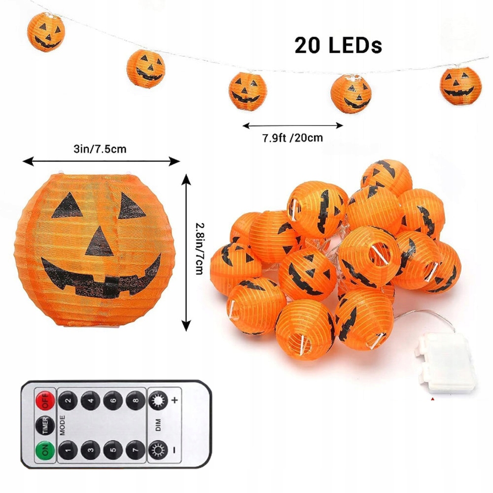 20 помаранчевих гарбузових ліхтариків діаметром 7, 5 см, 20 ручок, 20 світлодіодів теплого білого кольору. Довжина хеловінських вогників 4м, довжина кабелю живлення 0,3м, відстань лампи 0,2м. Дуже підходить для прикраси інтер'єру, саду та Хелловіна.
