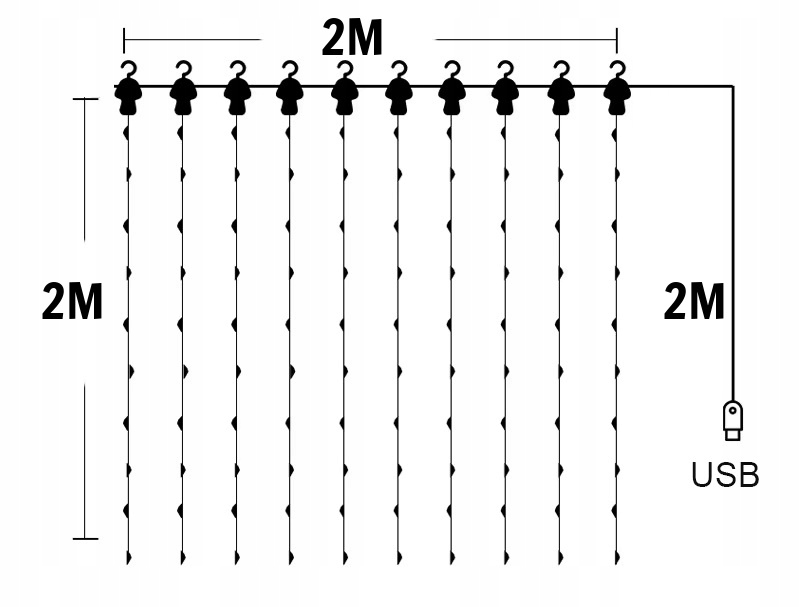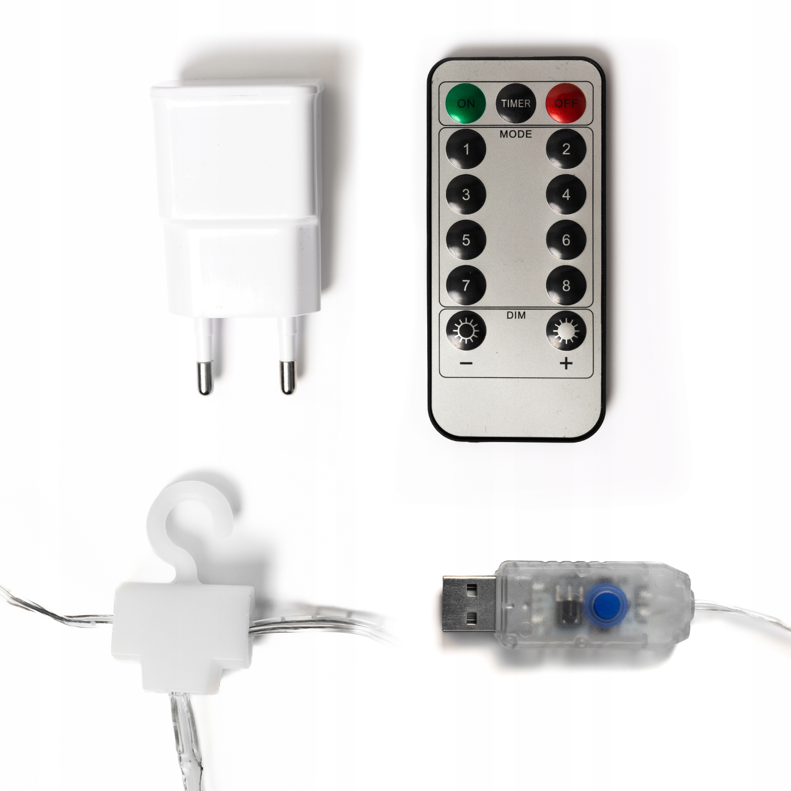 Завіса живиться через USB (довжина кабелю живлення 2 метри), тому для її освітлення не потрібен прямий доступ до електрики. У набір входить USB-АДАПТЕР, якщо ми хочемо живити набір безпосередньо від мережі