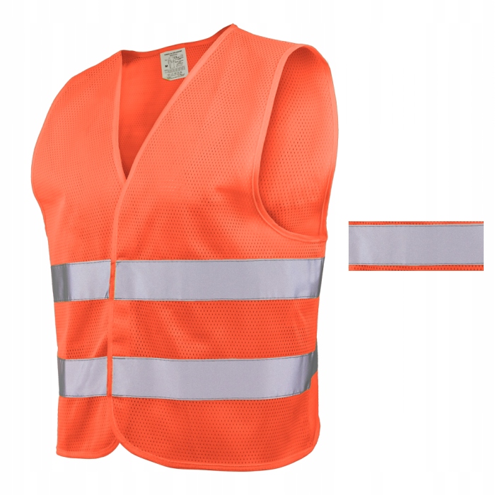 Світловідбиваючий жилет із високоякісної поліестерової сітчастої тканини - ажурj флуоресцентно-помаранчевого кольору з додатковими двома світловідбиваючими смужками, застібаються спереду на липучку.