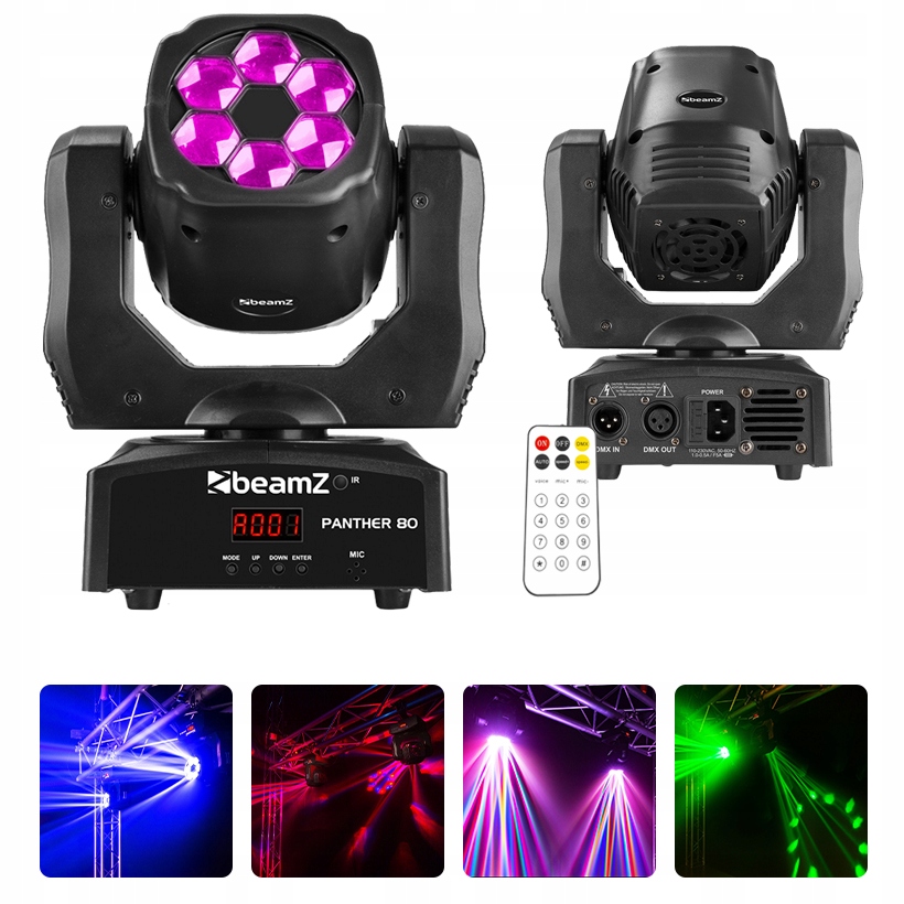 За допомогою рухомої голови BeamZ Panther 80 ви можете створювати найкрасивіші світлові шоу. Він оснащений 6 світлодіодами, встановленими на диску. Оскільки цей диск може нескінченно обертатися в обох напрямках, Panther 80 створює унікальний і прекрасний ефект. Рухома головка також має 6 світлодіодів потужністю 12 Вт на діод, що забезпечує дуже високу світловіддачу, це діоди RGBW, завдяки яким рухома головка може відтворювати широкий спектр кольорів, включаючи пастельні.