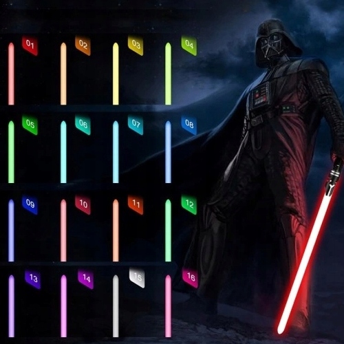 Наші світлові мечі мають 16 кольорів світла RGB. Утримуючи перемикач, щоб увімкнути світло RGB, клацніть перемикач, щоб змінити колір, двічі клацніть перемикач, щоб увійти в режим миготіння, із захоплюючою фоновою музикою та ефектом вібрації, щоб ви почувалися цікавіше.