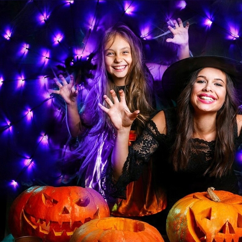 ◀ Павутинні світильники можуть прикрашати стіни, внутрішні дворики, огорожі, огорожі, ґанки та патіо тощо. Хеллоуїнські вогні ідеально підходять для тематичних вечірок, костюмованих вечірок і маскарадів, барів і будинків жахів тощо. Це також ідеальний подарунок на Хелловін.