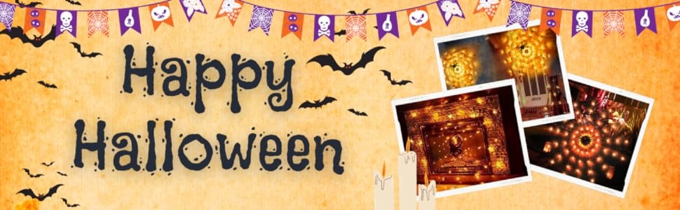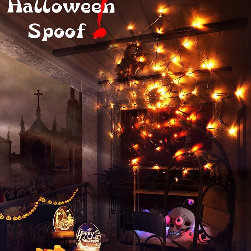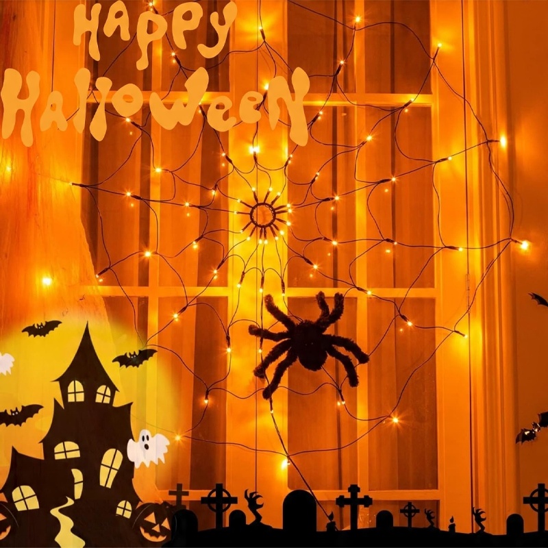 ◀ Павутинні світильники можуть прикрашати стіни, внутрішні дворики, огорожі, огорожі, ґанки та патіо тощо. Хелловінські вогні ідеально підходять для тематичних вечірок, костюмованих вечірок і маскарадів, барів і будинків жахів тощо. Це також ідеальний подарунок на Хелловін.