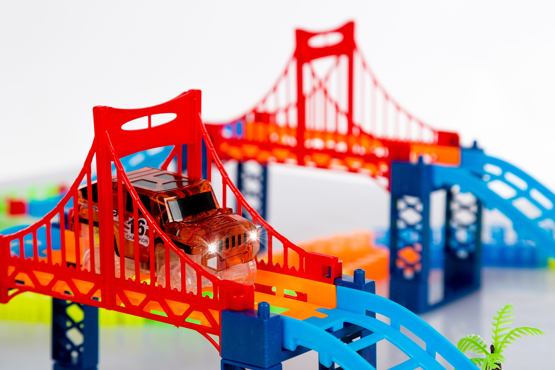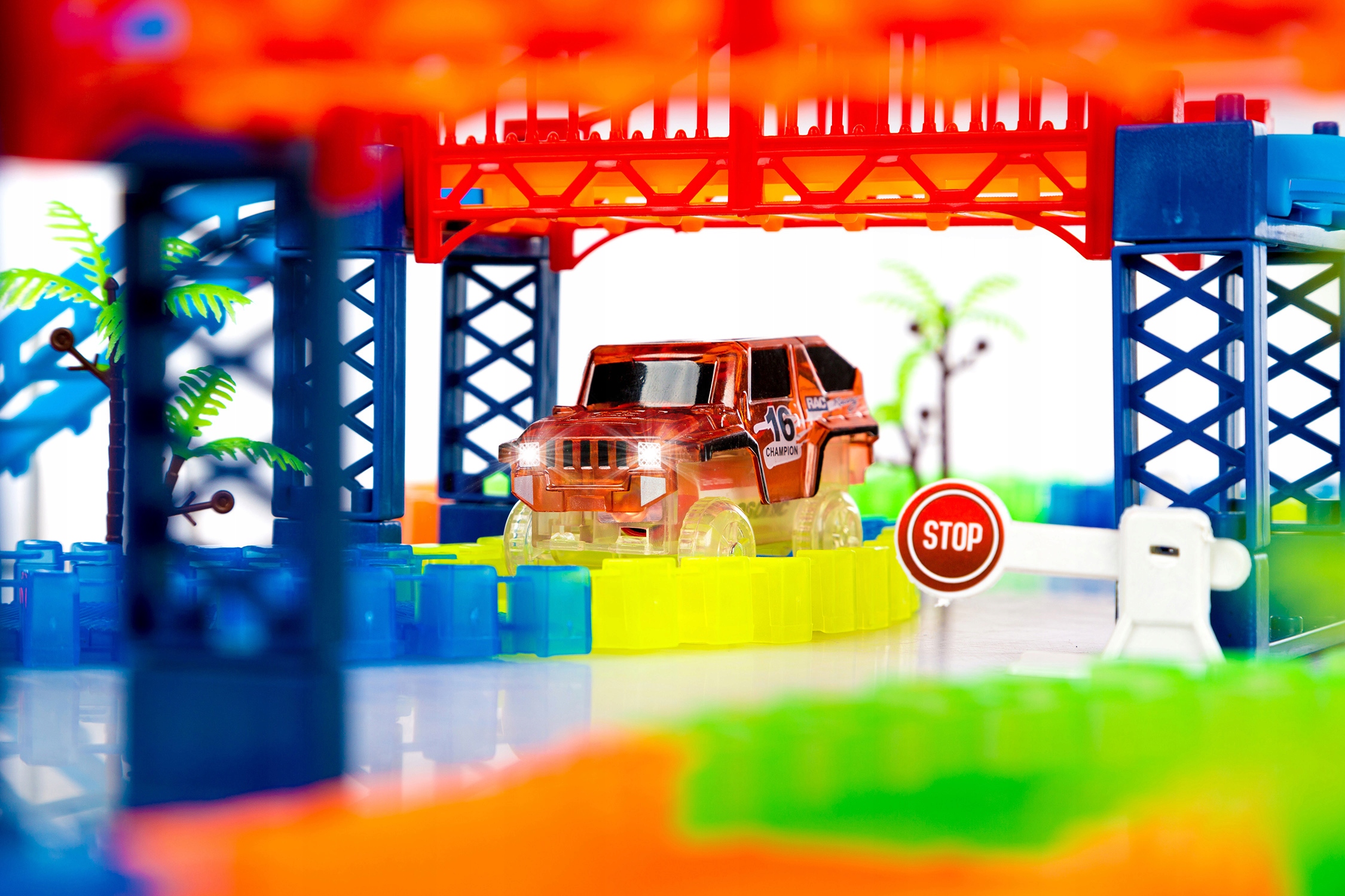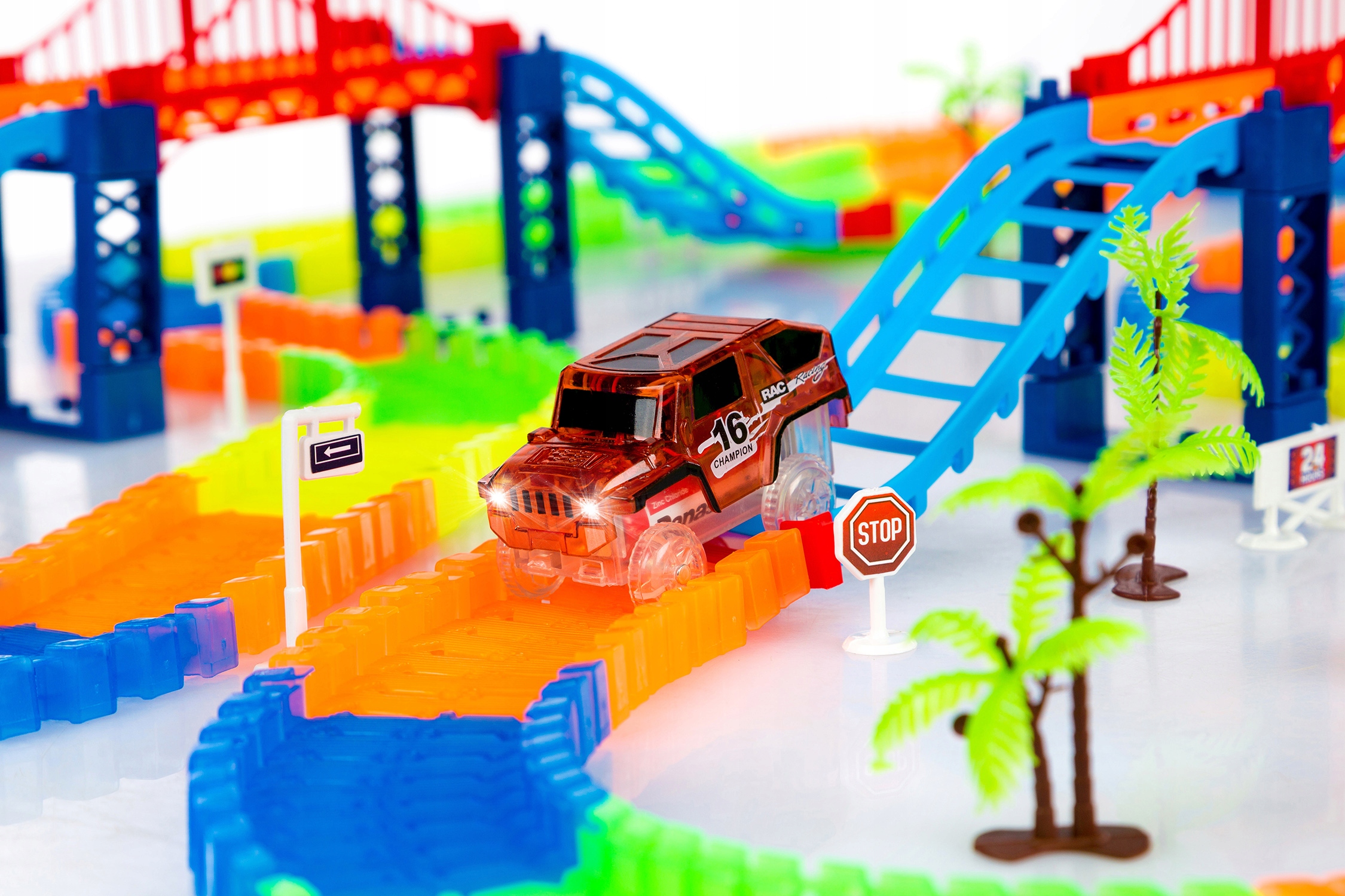 Доріжку можна вільно скручувати та згинати, створюючи нові маршрути. Ви можете з'єднувати елементи в будь-якому порядку і веселитися всією сім'єю. Це 5-метрова траса для любителів автомобілів, трас, гонок і конструкторів. Все, що вам потрібно зробити, це завести машину, поставити її на дорогу та спостерігати, як вона швидко ковзає по створених вами поворотах.