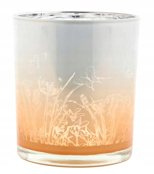 Скляний свічник білого та димчасто-коричневого відтінків. Прикрашений тонким мотивом польових квітів і лугу, який стає ще більш помітним на стінках підсвічника, коли свічку запалюють. Він стане приємною для ока прикрасою, яка ніжно підсвітить і підкреслить оформлення банкетного столу або створить приємну атмосферу під час спонтанної зустрічі.