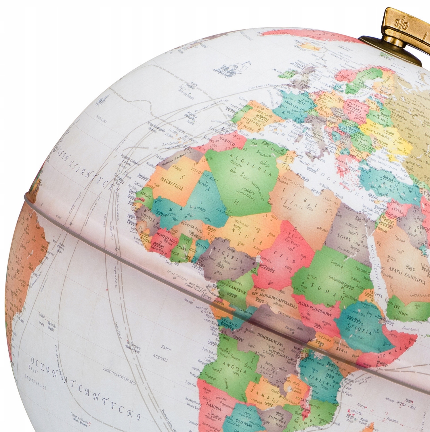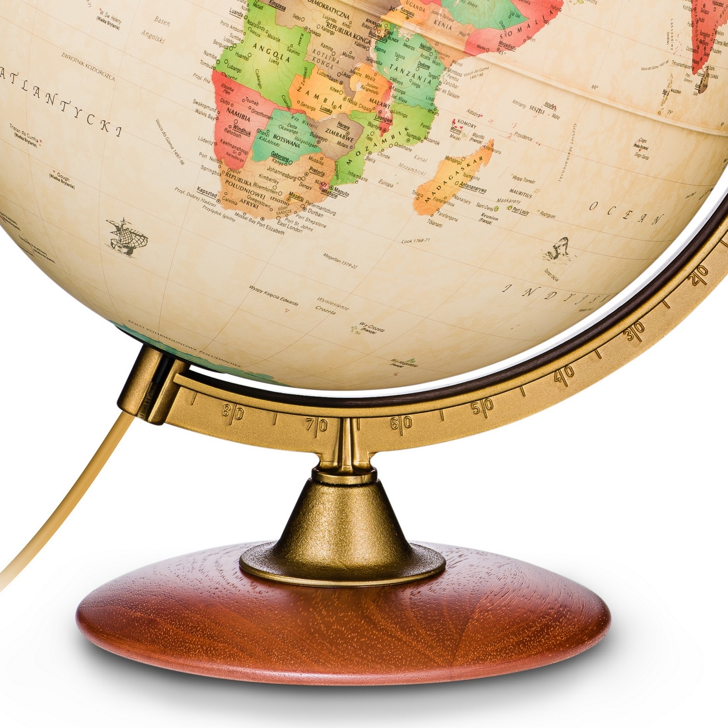Встановлюється на дерев'яну основу і кріпиться пластиковим меридіаном. Карта польською мовою. Розмір м'яча 30 см, висота 38 см. Легка заміна лампи.