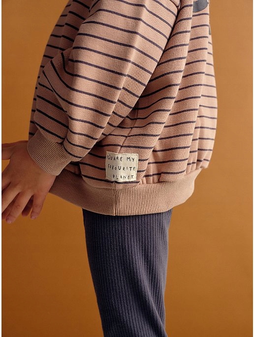 Смугастий світшот із написами на спині.