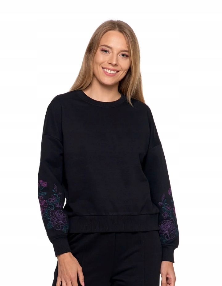 Це жіноча толстовка поєднує в собі комфорт і елегантність обробки. Завдяки вишитим рукавам він набуває унікального характеру, а бавовняний матеріал і вільний крій забезпечують комфорт у будь-якій ситуації.