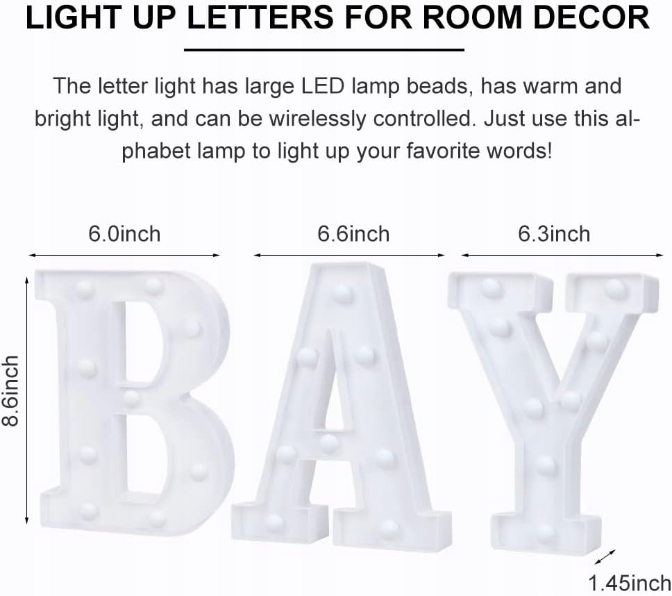 - Романтичні літери BABY Light Up - «БАБІ, я хочу подарувати тобі всю романтику» — це наша філософія дизайну. Букви БАБІ, як ручка і папір, ніби шепочуть тобі на вушко: МАЛЯ. Зірки ясні і сонце ясне. ДИТИЧКО, живи миттєвістю та сприймай любов і красу. Використовуйте цю лампу для алфавіту, щоб підсвічувати свої улюблені слова!