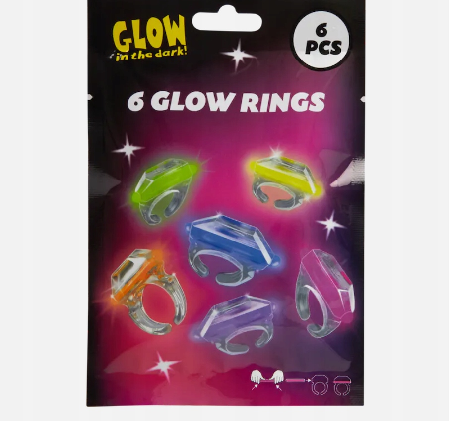 Набір містить 6 флуоресцентних кілець, які світяться кілька годин після активації. Сяйво досягається шляхом роздавлювання та струшування кілець, а потім надягання їх на палець. Кожне кільце світиться в темряві протягом кількох годин, створюючи унікальний світловий ефект.