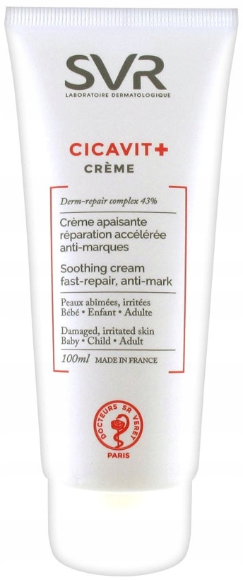 CICAVIT+ Creme від SVR. Крем для обличчя та тіла. Призначений для використання при поверхневих ранах шкіри та зовнішніх слизових оболонок, таких як подряпини, садна, тріщини, почервоніння, подразнення, попрілості, інтимні запалення, татуювання, сонячні опіки, лазерне лікування та пілінг, укуси комах. Можна вживати дорослим і дітям (з першого дня життя). Прискорює процеси відновлення епідермісу, знімає почервоніння, відчуття стягнутості та напруги, запобігає постзапальним слідам. Випускається в тубі 100 мл.