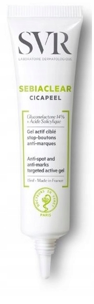 SVR SEBIACLEAR Cicapeel — ідеальний препарат, який приходить на допомогу при появі на обличчі різного роду прищів і чорних крапок. Цей активний точковий гель підсушує та усуває недоліки за рекордний час – 24 години, а також запобігає утворенню вугрових вогнищ. Непомітна на шкірі, нежирна формула діє протягом усього дня. До складу входить 14% глюконолактону, який є природним компонентом з кератолітичну дію. Його ефективність порівнянна з дією AHA-кислот, але він набагато м'якший і краще переноситься шкірою. Зменшує недоліки, розгладжує шкіру, очищає закупорені пори. Крім того, SVR Sebiaclear Cicapeel містить саліцилову кислоту, яка м’яко відлущує епідерміс, роблячи шкіру шовковистою.