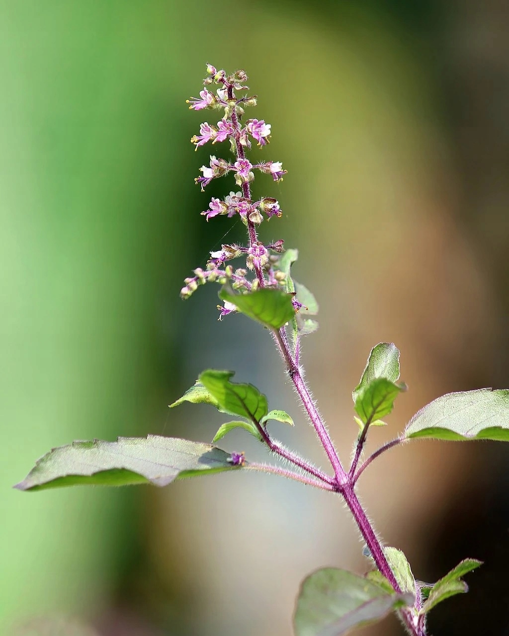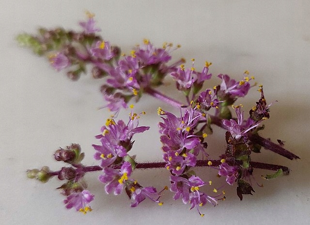 Базилік священний (Ocimum tenuiflorum), також званий Тулсі, королівський базилік або індійський базилік, є видом рослин із роду Базилік (Ocimum) з родина м'ятних. Їх природне поширення коливається від тропічної та субтропічної Азії до північної Австралії. Базилік може виростати до 100 см заввишки і є багаторічною рослиною, але не виносить морозів. Цей вид базиліка має волохате, злегка червонувате стебло з супротивно розташованими зеленими листками. Вони мають тонкі залозисті волоски і звужуються до кінця. На відміну від відомого нам базиліка (Ocimum basilicum), листя індійського базиліка зубчасті. Також вони трохи темніше і худіша своїх родичів. Як і Ocimum basilicum, базилік дає кінцеві суцвіття. Вони мають довжину від 6 до 8 см і містять 6 квіток у несправжніх мутовках. Квітка базиліка зазвичай має фіолетові і рідше білі пелюстки, що робить базилік чудовим привабливим засобом для бджіл. Він також видає свіжий, трав'яний і перцевий аромат, який трохи нагадує гвоздику. Цвіте трава тулсі з червня по вересень, а коли плоди дозрівають, з’являються коричневі або чорні горіхи у формі сльози. В індуїзмі тулсі називають «священною травою», вона відіграє роль у релігійних церемоніях і символізує божественний захист.