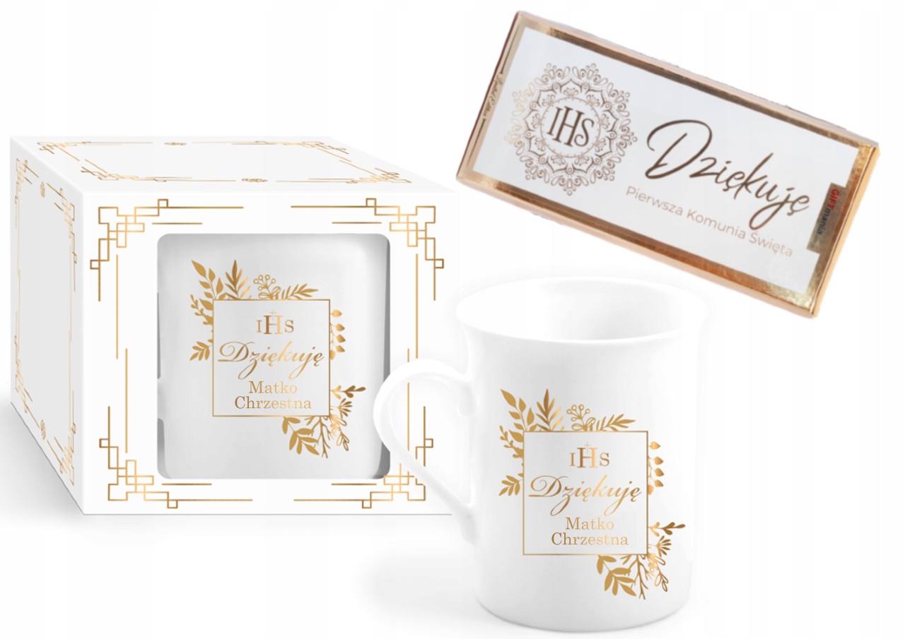 У набір входить кухоль із позолоченим принтом «Дякую тобі, Хрещена» та молочний шоколад у тон. Це буде ідеальним листом подяки для причастя.