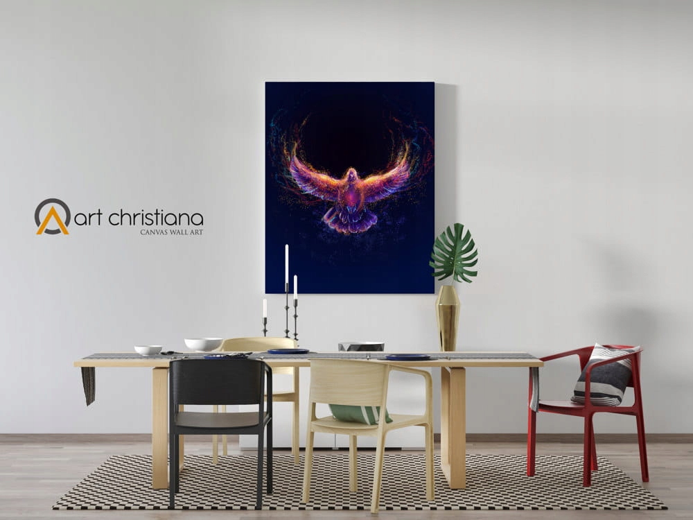 Релігійний живопис на полотні із символічним зображенням Святого Духа у вигляді голуба. Картина із символом Святого Духа може бути чудовим подарунком, вона неодмінно принесе тепло та колір у кімнату, а також може стати підмогою у щоденній молитві.