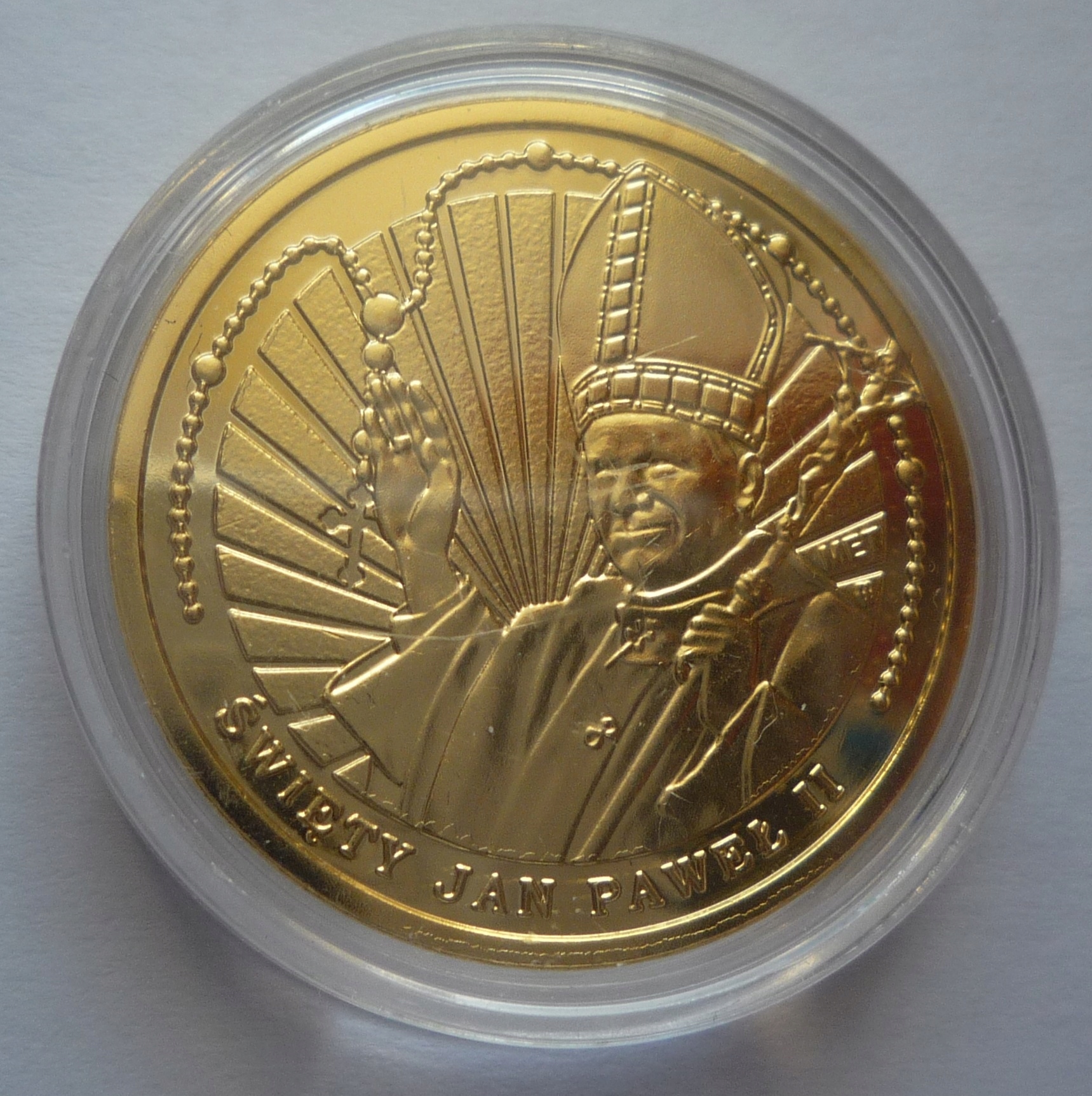 Реверс: У центрі, у неповному обідку, утвореному намистинами вервиць, зображено святого Івана Павла ІІ із круговими променями, що розходяться. у фоновому режимі; у нижній частині жетона напис півколом: СВЯТИЙ ІВАН ПАВЛО ІІ.