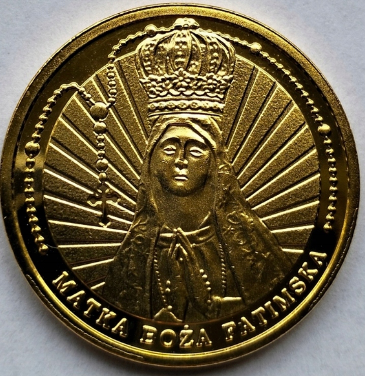 Аверс: у центрі, у неповному обідку, утвореному намистинками розарію, образ Богоматері Фатімської з круговими променями, що розходяться на тлі; у нижній частині жетона напис півколом: Богоматір Фатімська.