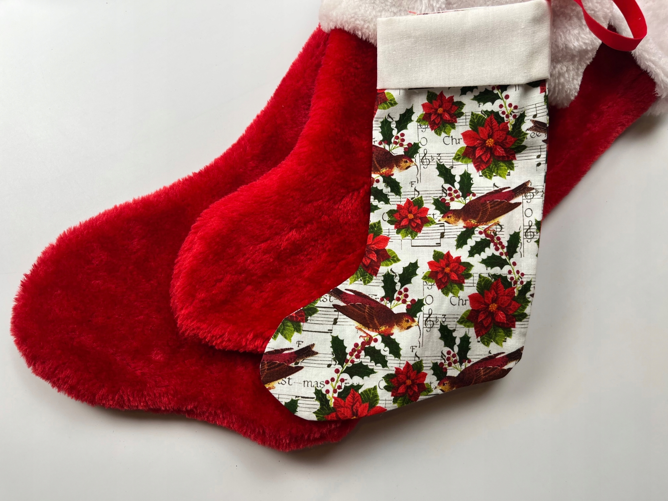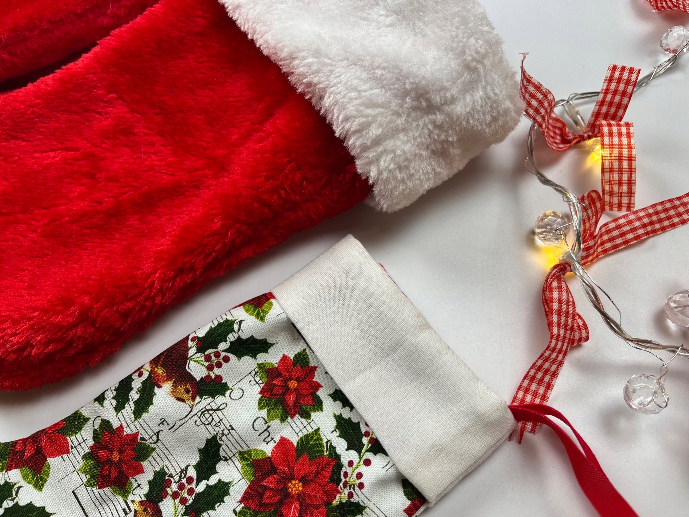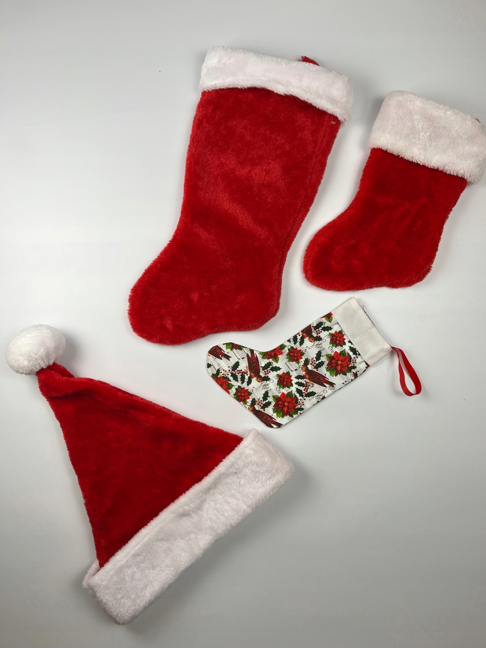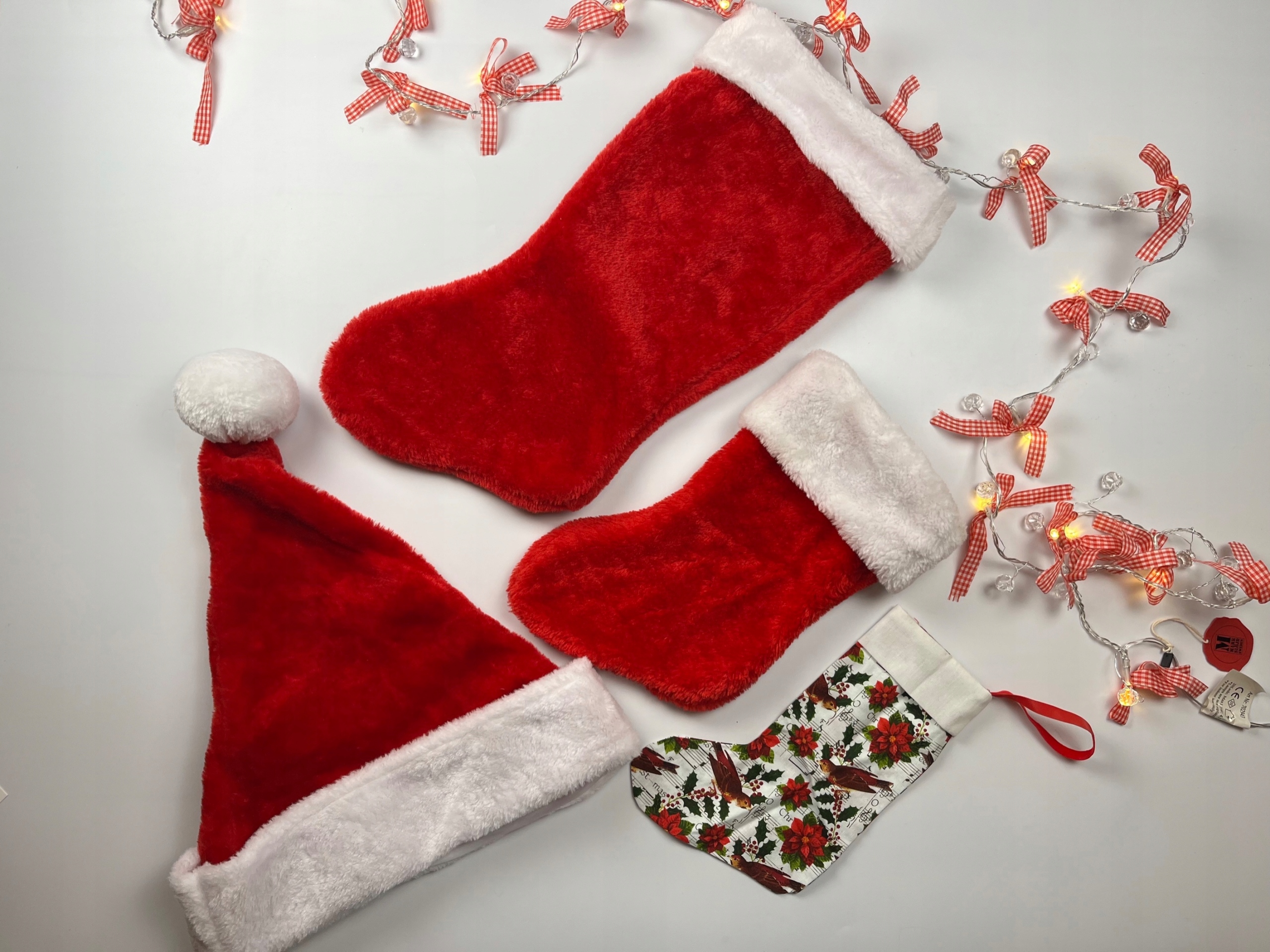 - Різдвяний декоративний набір. Набір складається з 3 декоративних шкарпеток у різних розмірах, а шапки Санта в розмірі L. Червоний білий набір, виготовлений з м'якого велюрового матеріалу. Найменший шкарпетка, виготовлений з білизнистого матеріалу. Він з чарівним, різдвяним принтом.