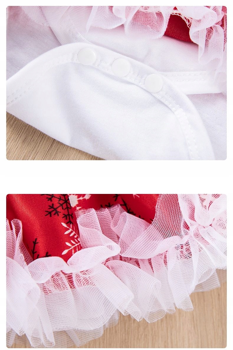 Нижня частина - приваблива спідниця, вшита прямо в боді, завдяки чому одяг зручний і не з'їжджає під час руху. Червона спідниця з мотивом сніжинки виготовлена ​​з матеріалу з красивою блискучою обробкою. Низ оздоблений шаром м'якого фатину, який надає укладці виняткової легкості та робить її схожою на справжнє маленьке бальне плаття. Все це виглядає надзвичайно святково та по-дівчачому.