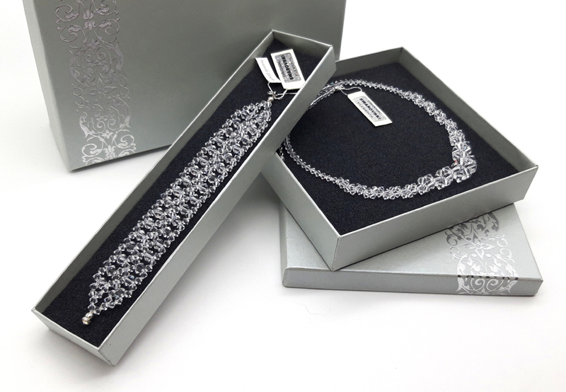 Браслет виготовлено з кристалів кольору кришталюрозміром 4 мм та перлин з елементами Swarovski розміром 10, 8, 6 та 4 мм. темно-синього кольору.