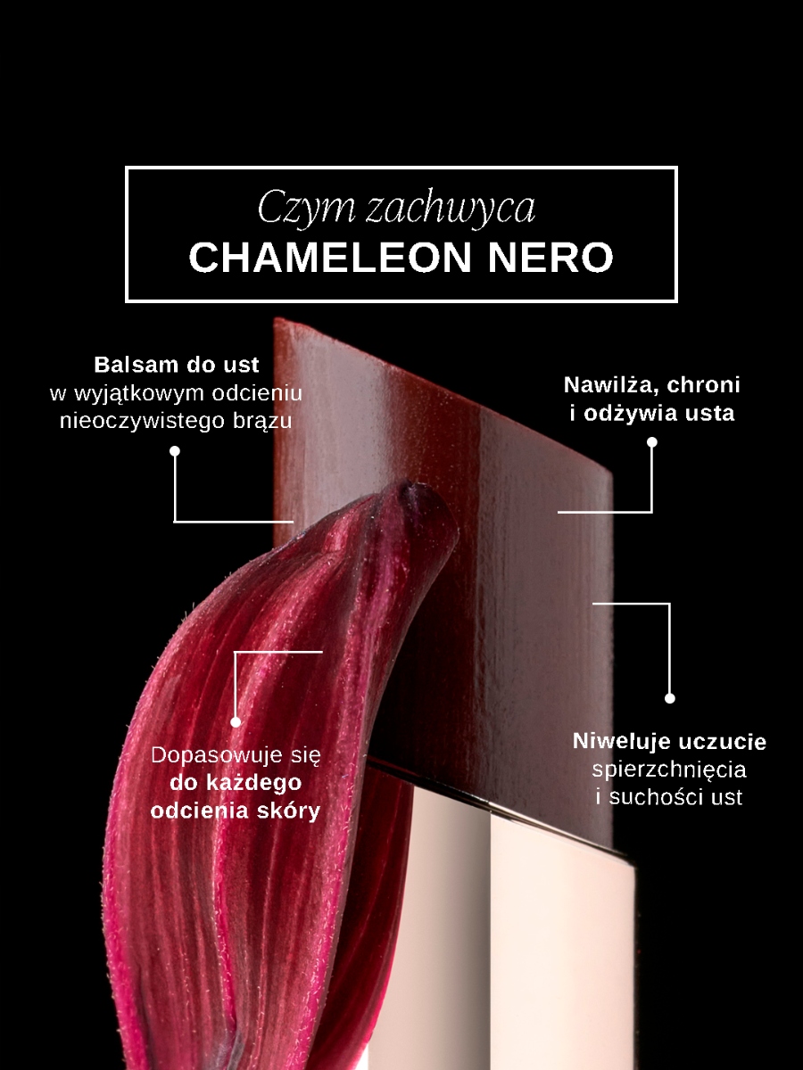 Унікальний колір підходить для широкого діапазону тонів шкіри, і його інтенсивність можна змінювати. CHAMELEON NERO поєднує в собі переваги губної помади, бальзаму та блиску для губ, огортаючи губи тривалим зволоженням, глибоким живленням, тонким кольором і блиском.
