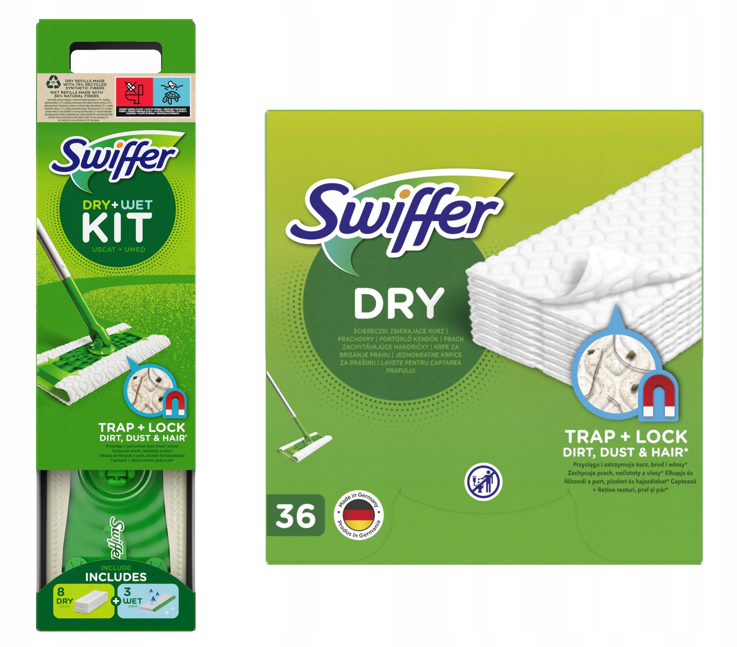 Стартовий набір також включає три вологі серветки. Вологі серветки для підлоги ретельно розчиняють бруд і забруднення, а потім вбирають їх, залишаючи свіжий запах чистоти. Крім того, головка швабри Swiffer, що обертається на 360°, дозволяє ретельно очистити весь будинок, включаючи важкодоступні місця, такі як поверхні під холодильником, плитою або посудомийною машиною, під ліжками, диванами, а також у кутах і куточки, куди не можуть дістатися звичайні щітки для підмітання та щітки.