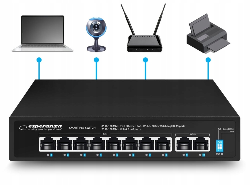 - 8 портів RJ45 PoE 10/100 Мбіт/с + 2 порти висхідного зв’язку RJ45 з автоматичним визначенням швидкості з’єднання